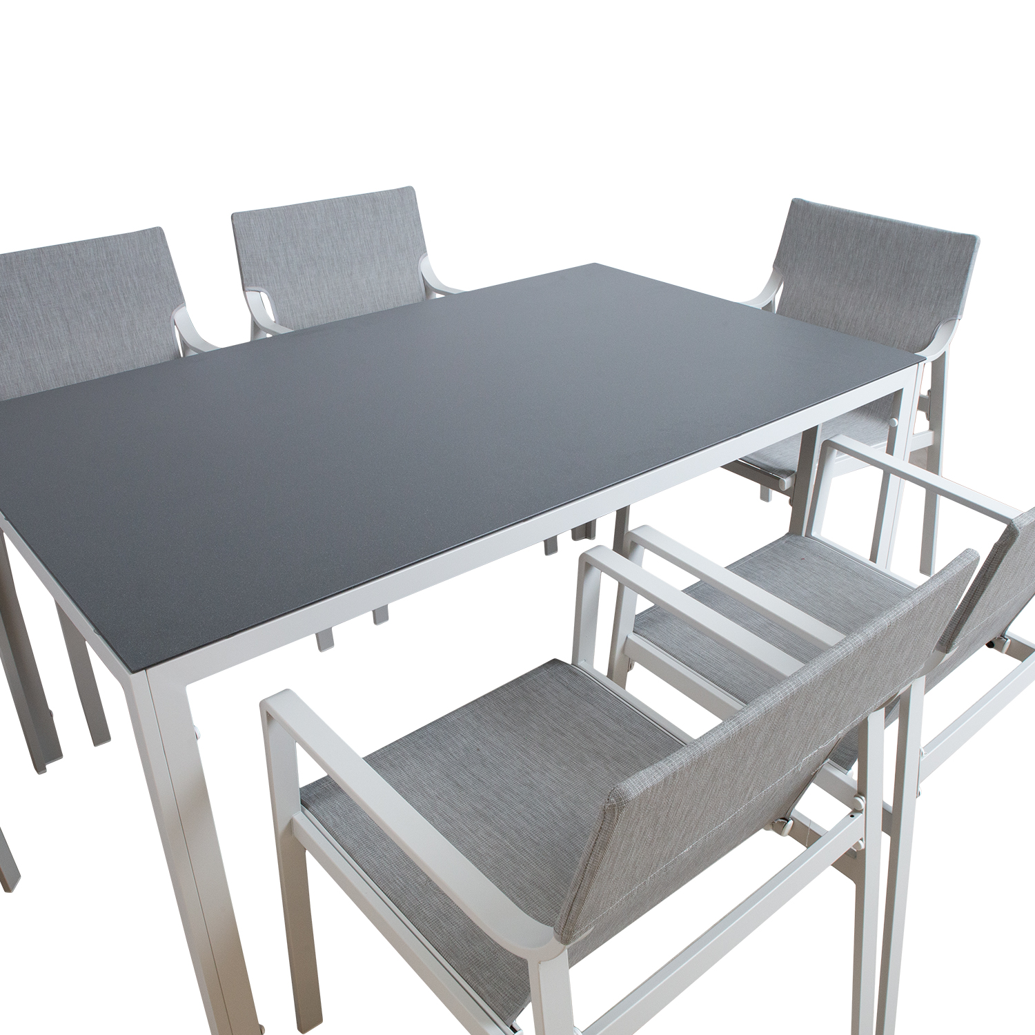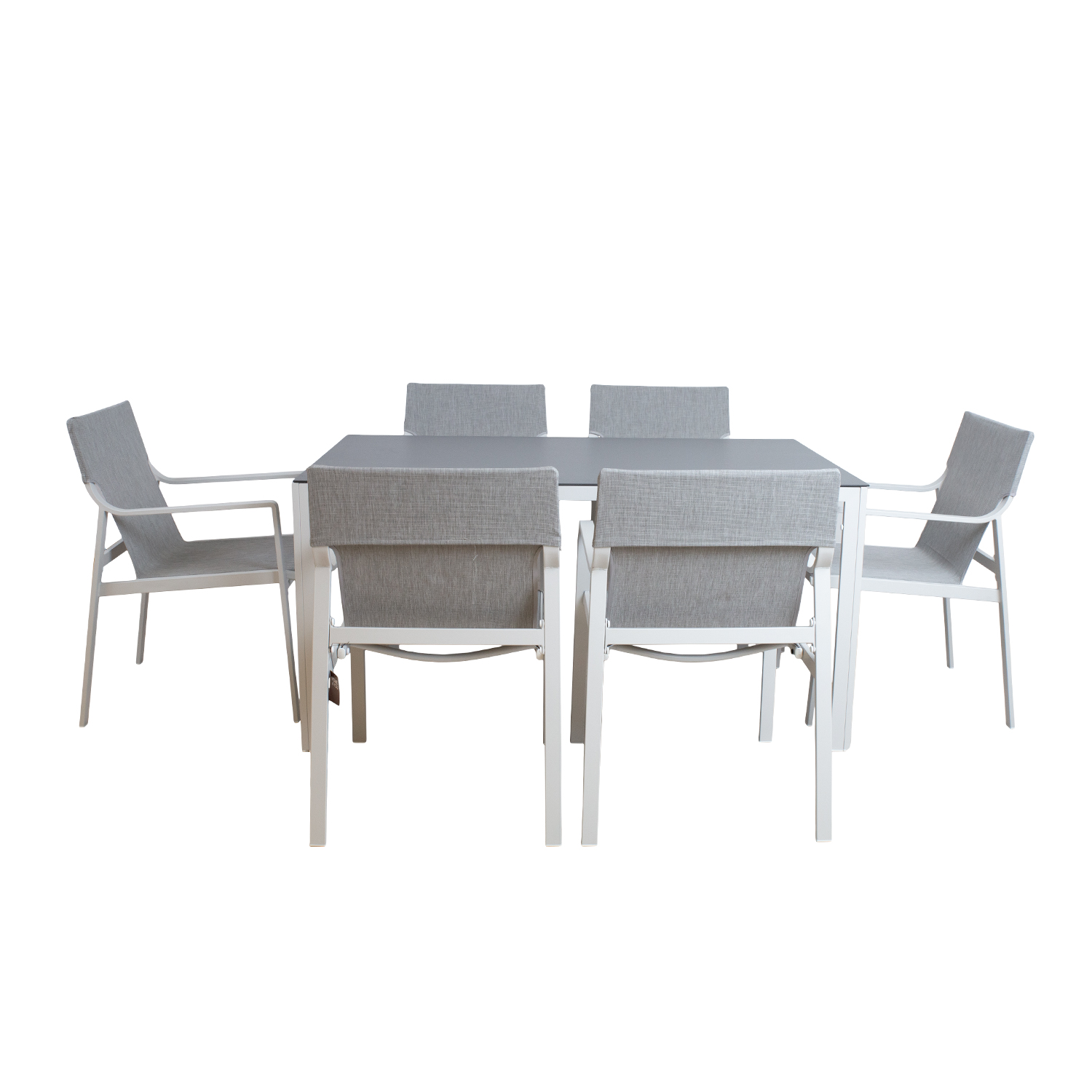 Sodo baldų komplektas OSMAN stalas ir 6 kėdės. Stalo kojos ir rėmas pagaminti iš aliuminio ir nudažyti milteliniu būdu. Stalas turi pilką 5 mm grūdinto stiklo stalviršį. Kėdžių rėmas pagamintas iš plieno. Tekstilinė kėdės sėdynė praleidžia orą ir greitai džiūsta. Stalo matmenys 150x90xH74 cm. Kėdės matmenys 55x62xH86 cm. Ribinis svoris 100 kg. Gaminys labai atsparus besikeičiančioms oro sąlygoms ir lengvai prižiūrimas. PRIEŽIŪRA: pasibaigus vasaros sezonui, rekomenduojame sodo baldus laikyti patalpoje. Pasibaigus vasaros mėnesiams, sodo baldus reikėtų laikyti namuose. Sandėliavimui naudokite sausą ir gerai vėdinamą patalpą.