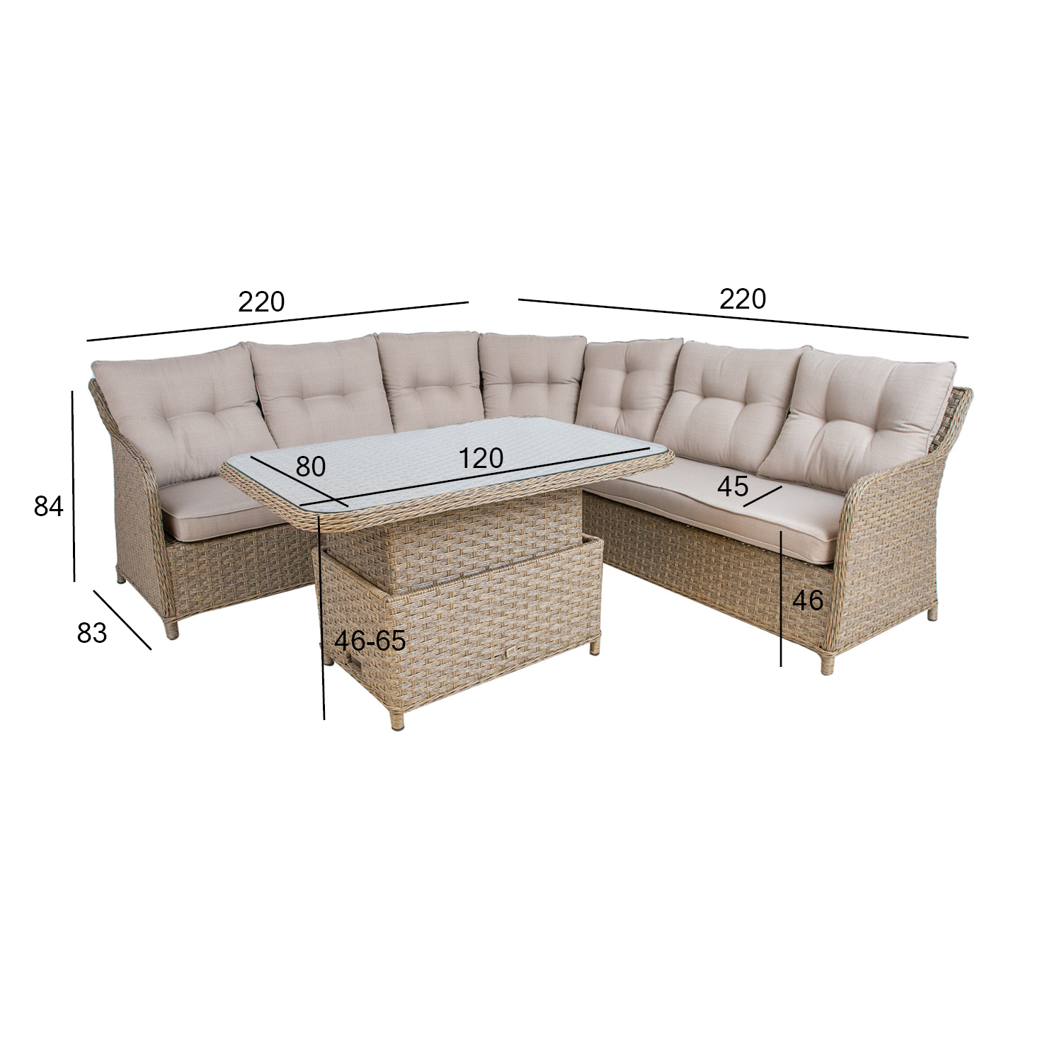 PACIFIC sodo baldų komplektą galima derinti su visais tos pačios serijos gaminiais. Komplektą sudaro kampinė sofa su minkštomis pagalvėlėmis ir reguliuojamo aukščio stalas. Visų komplekto dalių rėmai pagaminti iš aliuminio ir padengti plastikine apyranke. Kampinę sofą sudaro 3 moduliai: 2 vietų modulis su kairės ir dešinės pusės porankiais 124x83xH84 cm, kampinis modulis 158x83xH84 cm. Sėdynės aukštis 46 cm (su pagalve), porankio aukštis nuo žemės 62 cm. Stalo matmenys 120x80xH46/65 cm, stalo stalviršis: 5 mm grūdintas skaidrus stiklas. Pagalvėlės užvalkalas iš poliesterio audinio. Komplektą sudaro 2 sėdimosios pagalvės 118x63xH10cm, lenkta sėdimoji pagalvė 40/125x63xH10cm, 4 atlošo pagalvės 65x56x11cm, 3 atlošo pagalvės 58x58x11cm. Gaminys atsparus besikeičiančioms oro sąlygoms ir labai lengvai prižiūrimas. Pagalvėlės pagamintos medžiagos, tinkamų naudoti lauke, tačiau dėl didelės drėgmės gali atsirasti pelėsis, o dėl UV spindulių užvalkalas gali prarasti spalvą. Pagalvių dėžė yra geras sprendimas čiužiniams laikyti ir kasdien palaikyti juos sausus. Norėdami prailginti lauko baldų tarnavimo laiką, rekomenduojame naudoti lauko baldų užvalkalus. PRIEŽIŪRA: Pasibaigus vasaros sezonui, rekomenduojame sodo baldus laikyti patalpoje. Vasaros sezonui rekomenduojame palikti sodo baldus žiemos mėnesiais. Sandėliavimui naudokite sausą ir gerai vėdinamą patalpą.
