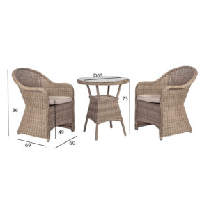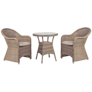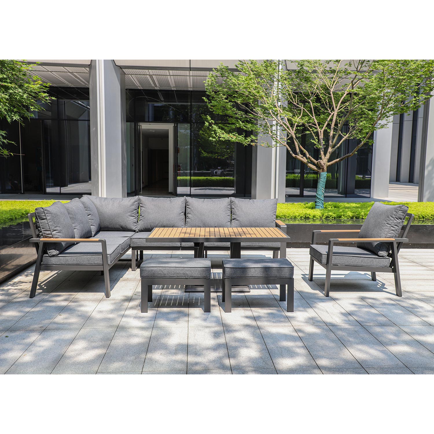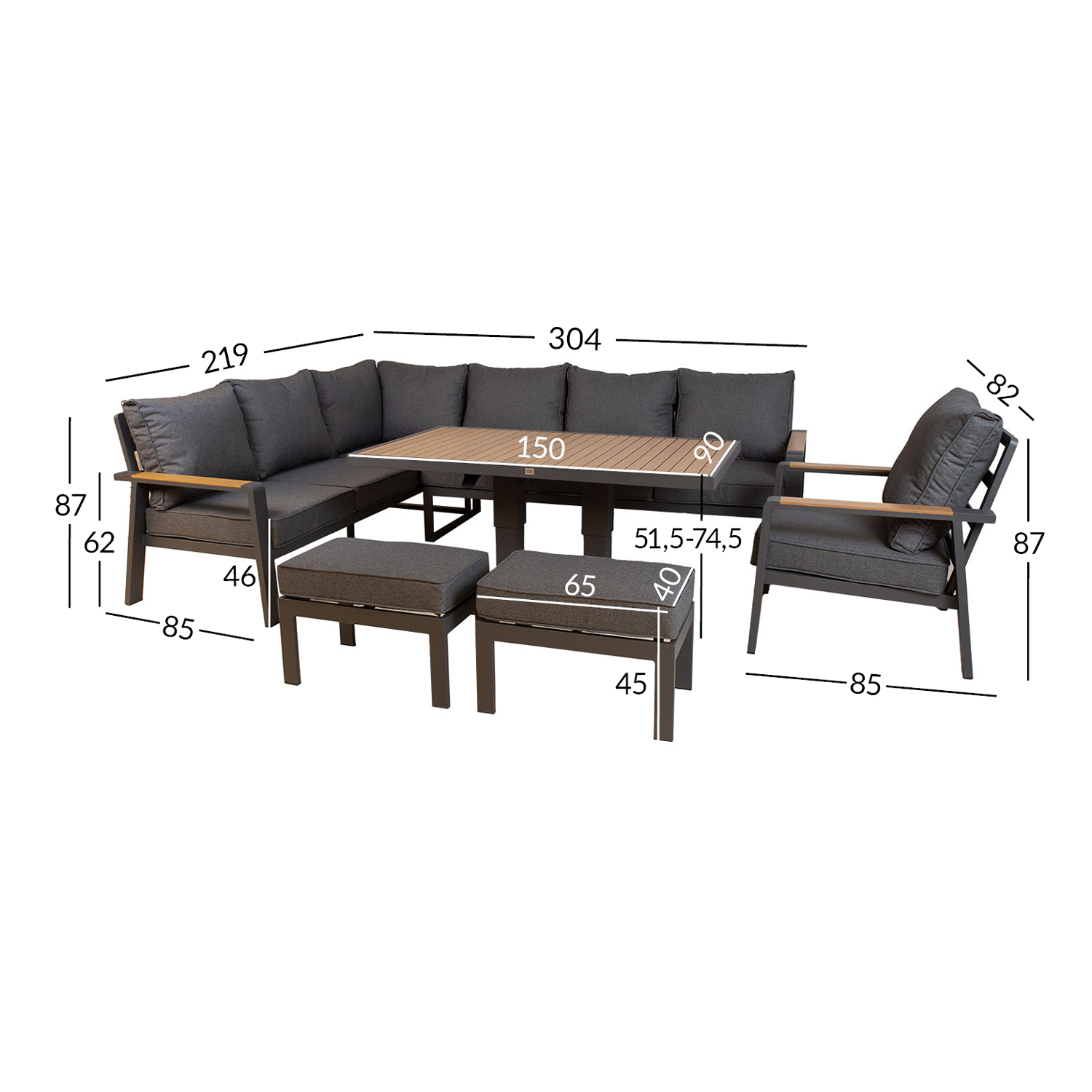 Sodo baldų komplektas PARKER 5 dalių. Rinkinį sudaro reguliuojamo aukščio stalas, kampinė sofa, fotelis ir 2 kėdės. Visų dalių rėmai pagaminti iš aliuminio ir nudažyti pilkais milteliniais dažais. Stalo stalviršio ir fotelio porankių paviršiaus apdaila išgauta šiluminio pernešimo spaudos būdu, tekstūra primena natūralaus medžio tekstūrą. Norint medžio tekstūrą perkelti ant aliuminio paviršiaus, ant aliuminio profilio uždedama perkėlimo plėvelė, kuri po to veikiama dideliu karščiu. Šio proceso metu rašalas nuo perkėlimo plėvelės persiduoda ant aliuminio paviršiaus ir sukuria medieną primenantį efektą. Taip apdorotas paviršius yra labai patvarus, atsparus saulės spinduliams ir nedideliems įbrėžimams. Rinkinį sudaro 6+1 sėdimoji pagalvė, 7+1 atlošo pagalvėlė ir 2 plunksninės sėdynės pagalvėlės. Pagalvių užvalkalai pagaminti iš pilko poliesterio audinio. Kampinę sofą sudaro dvi 220x85xH87 cm ir 200x82xH87 cm dydžio dalys. Stalo matmenys 150x90xH51,5/74,5 cm. Fotelio matmenys 82x85xH87 cm. Porankių atramų aukštis nuo žemės yra 62 cm. Sėdynės aukštis 33/46 cm. Tambūro matmenys 65x40xH33/45 cm. Gaminys yra atsparus besikeičiančioms oro sąlygoms ir labai lengvai prižiūrimas. Tik pagalvėles reikia saugoti nuo atmosferos poveikio. Norėdami prailginti lauko baldų tarnavimo laiką, rekomenduojame naudoti lauko užvalkalus. PRIEŽIŪRA: pasibaigus vasaros sezonui, rekomenduojame sodo baldus laikyti patalpoje. Jei plaktuko sezonui, rekomenduojame palikti baldus sode žiemos mėnesiais. Sandėliavimui naudokite sausą ir gerai vėdinamą patalpą.