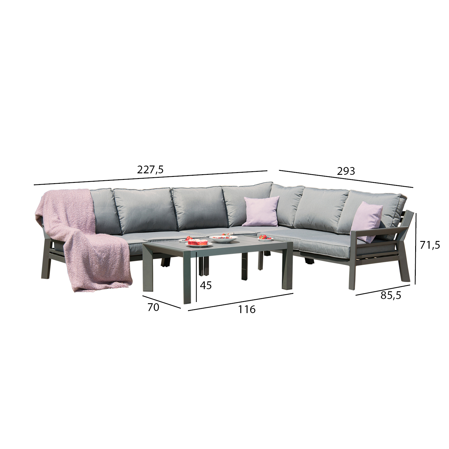 Sodo baldų komplektas TOMSON stalas ir kampinė sofa, pilkos spalvos. Sofa ir stalas pagaminti iš aliuminio ir nudažyti tamsiai pilkais milteliniais dažais. Kampinę sofą sudaro trys dalys: 2-vietis kairysis fotelis 142×85,5xH71,5 cm, 2-vietis dešinysis fotelis 142×85,5xH71,5 cm, 2-vietė kampinė sekcija 151×85,5xH71,5 cm. Stalo matmenys 116x70xH45 cm. Į komplektą įeina 6 sėdynių pagalvėlės ir 7 atlošo pagalvėlės. Pagalvėlės pagamintos iš pilko olefino audinio. Gaminys labai atsparus besikeičiančioms oro sąlygoms ir lengvai prižiūrimas. Tik pagalvėles reikia apsaugoti nuo oro sąlygų. Norėdami prailginti lauko baldų tarnavimo laiką, rekomenduojame naudoti lauko užvalkalus. PRIEŽIŪRA: Pasibaigus vasaros sezonui rekomenduojame sodo baldus laikyti patalpoje. Pasibaigus vasaros sezonui, rekomenduojame palikti baldus sode žiemos mėnesiais. Sandėliavimui naudokite sausą ir gerai vėdinamą patalpą.