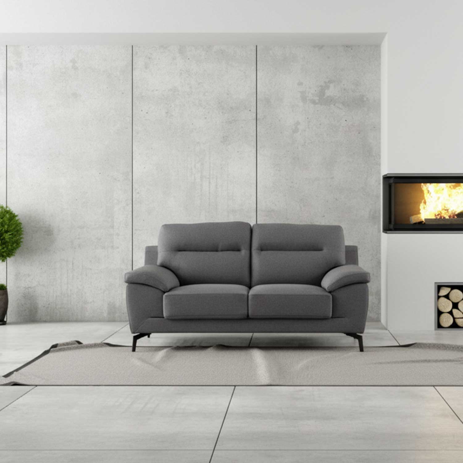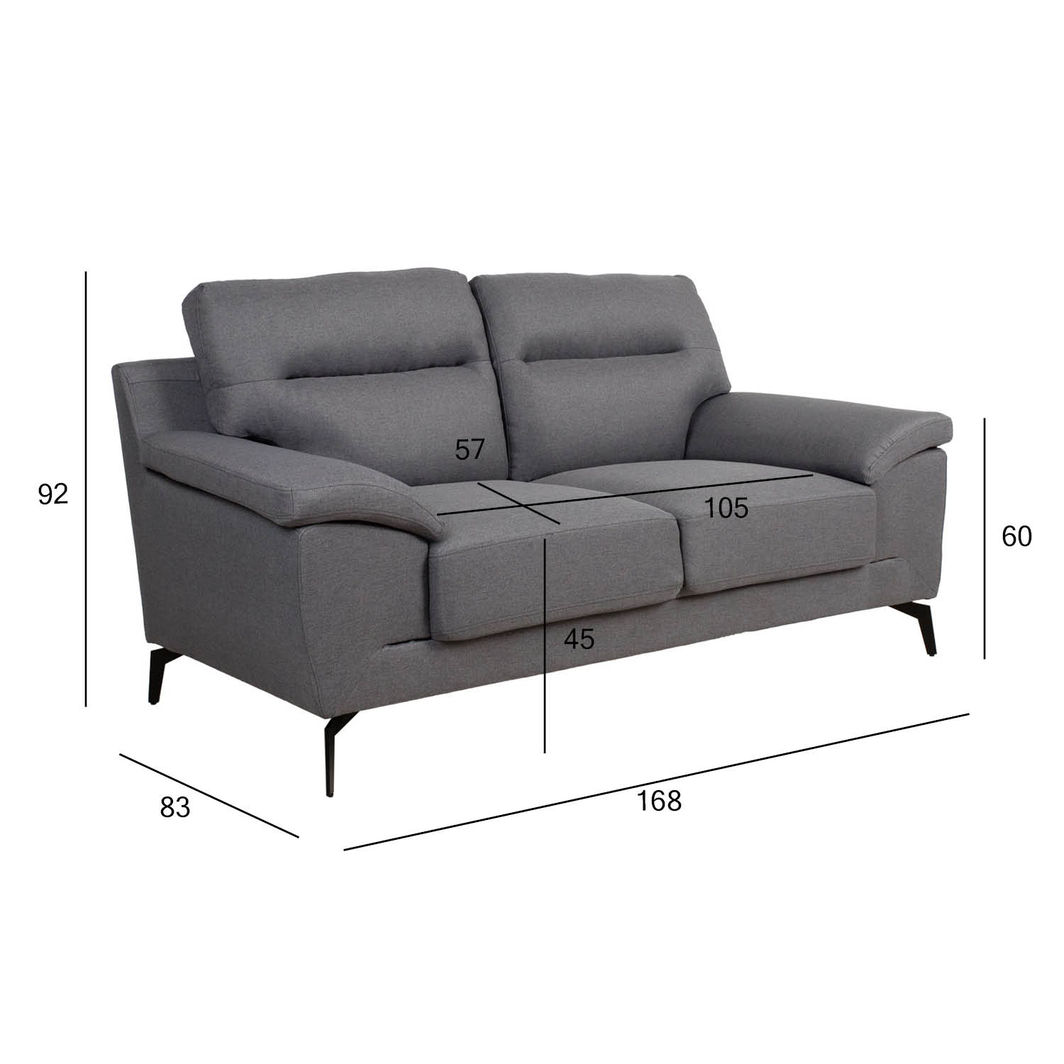 Sofa ENZO 2 vietų, tamsiai pilka. Karkasas pagamintas iš medžio masyvo ir faneros. Apmušalai pagaminti iš 25 kg/m³ tankio poliuretano putų. Sėdynės viduje yra kišeninių spyruoklių blokas. Atviros nugaros pagalvėlės prie atlošo tvirtinamos užtrauktuku ir dirželiu. Pagalvėlės užpildytos poliesterio putplasčiu. Užvalkalo medžiagą: 100 % poliesterio audinys. Bendrieji sofos matmenys: 168x83xH92 cm. Sėdimosios dalies plotis 105 cm, sėdimosios dalies gylis 57 cm, sėdimosios dalies aukštis 45 cm. Porankio aukštis nuo žemės 60 cm, porankio plotis 32 cm. Sofa turi tamsaus metalo kojas H14 cm.