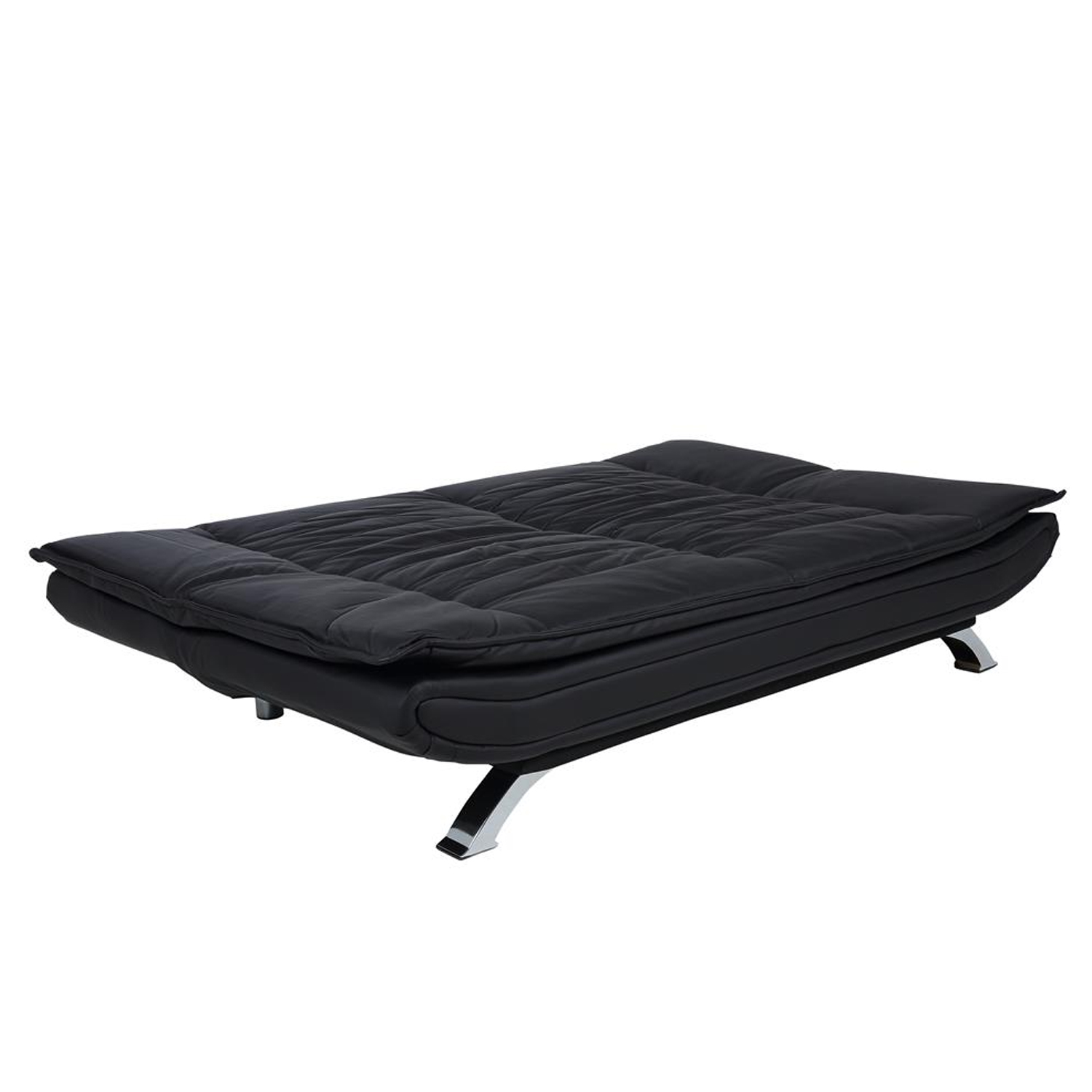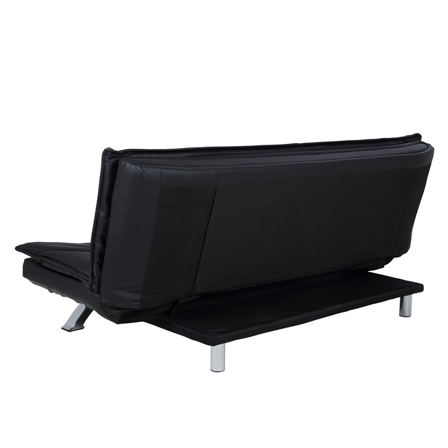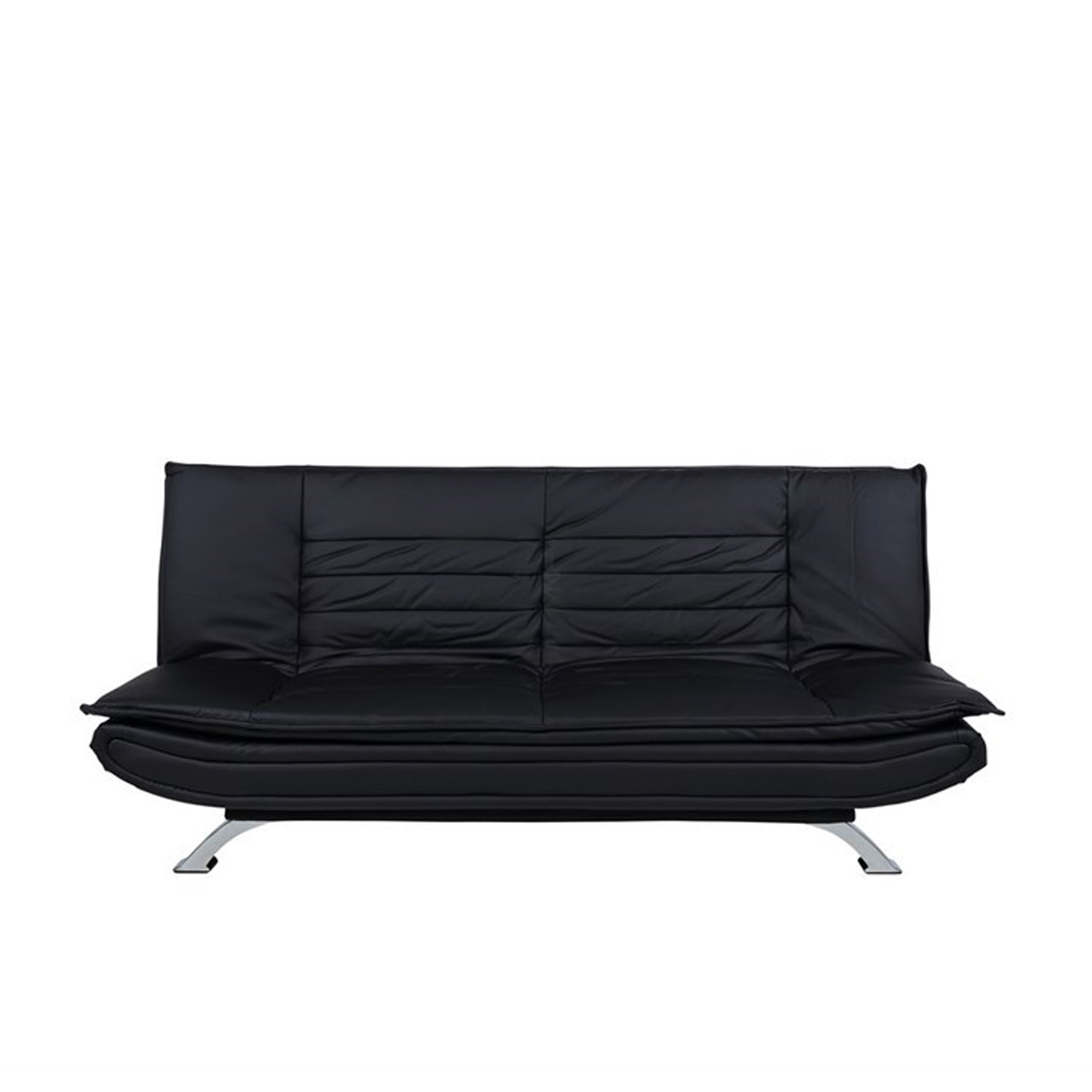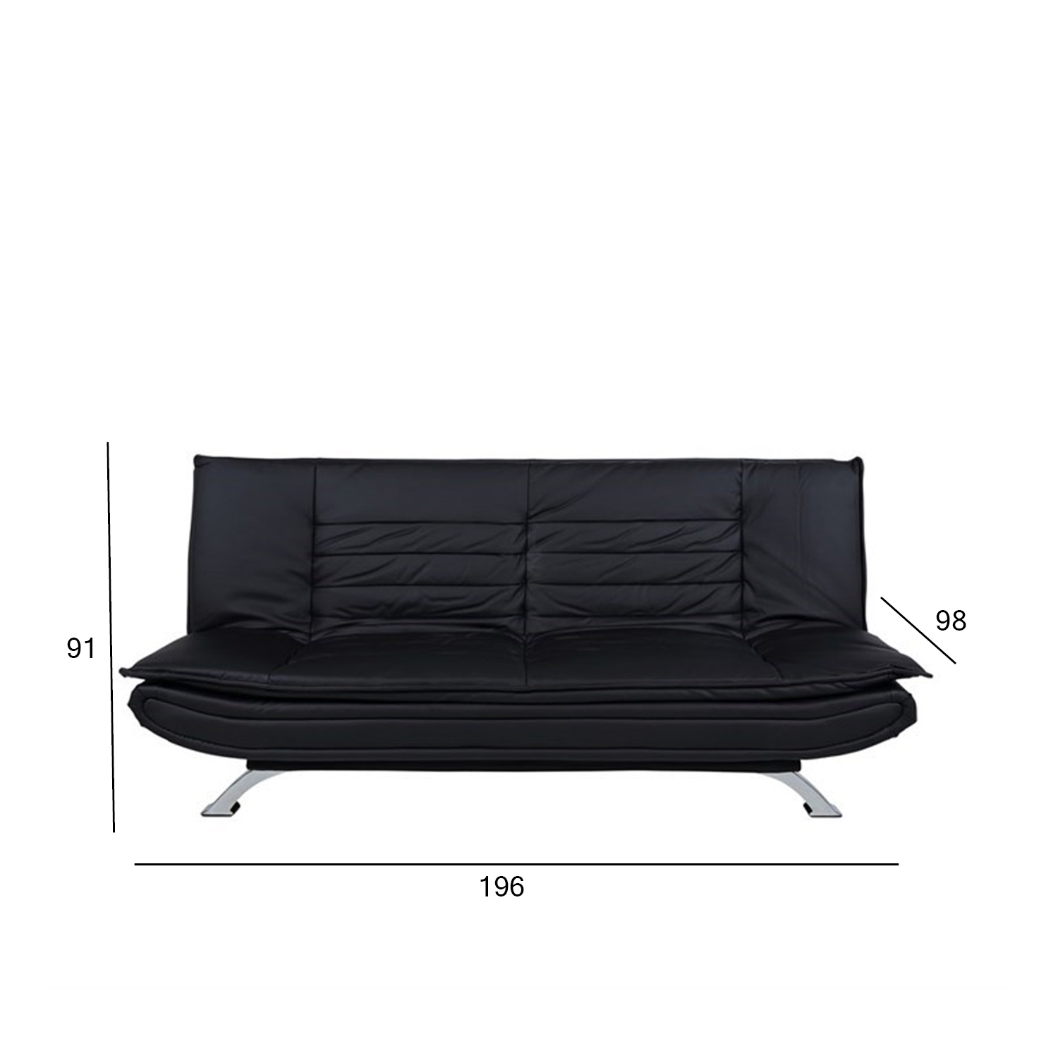 Sofa lova FAITH juoda. Užvalkalo medžiaga – dirbtinė oda. Kojos pagamintos iš metalo, chromo spalva. Išskleistos sofos-lovos matmenys 196×123 cm. Gaminio matmenys 196x98xH91 cm.