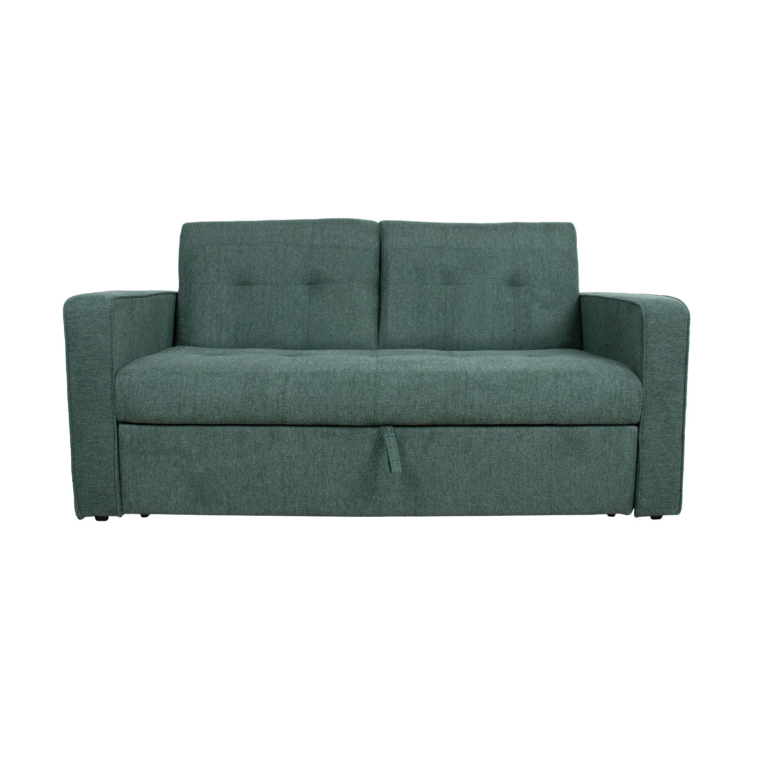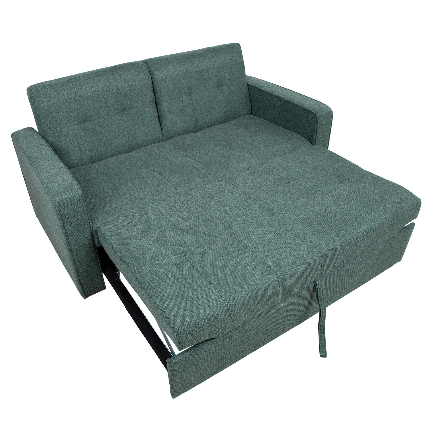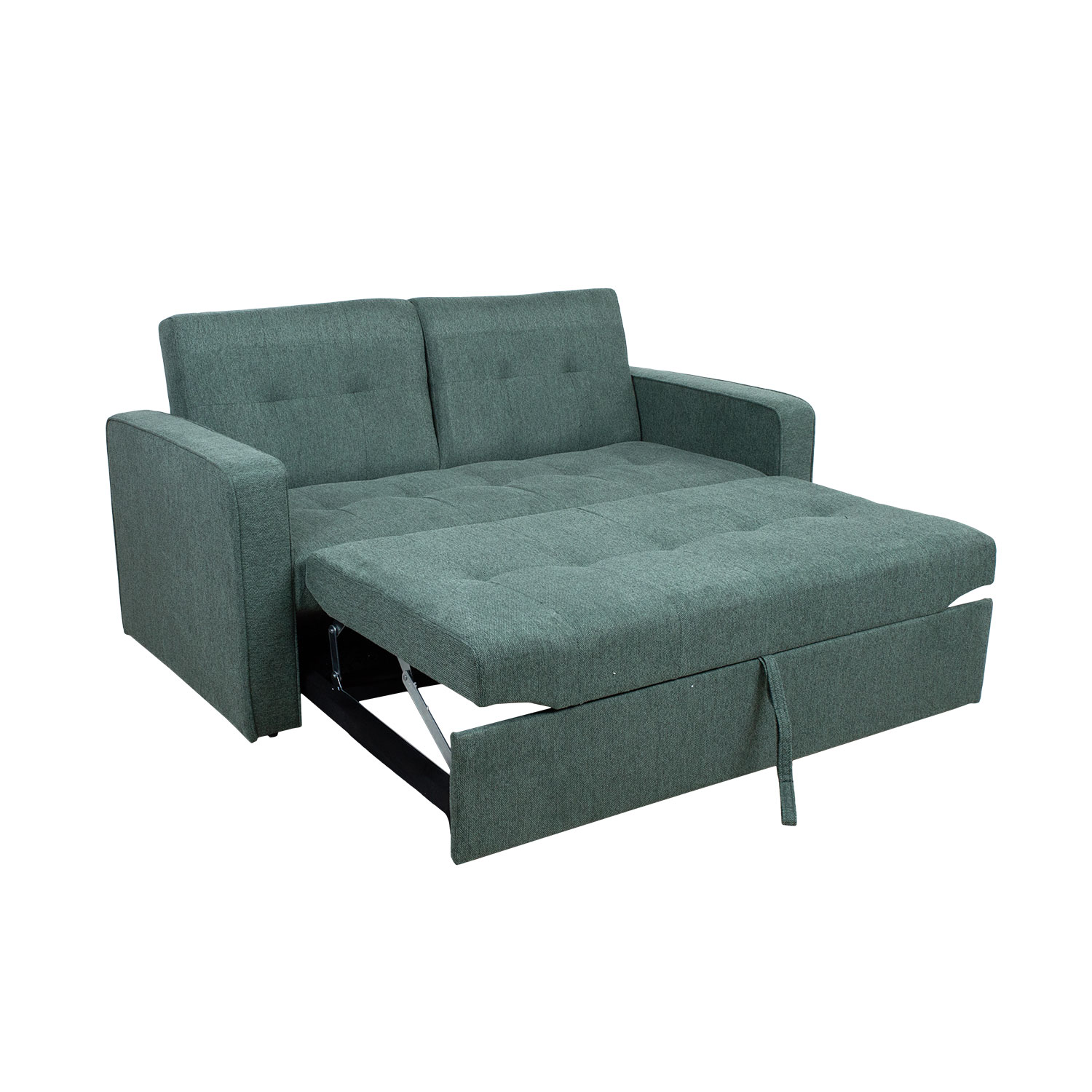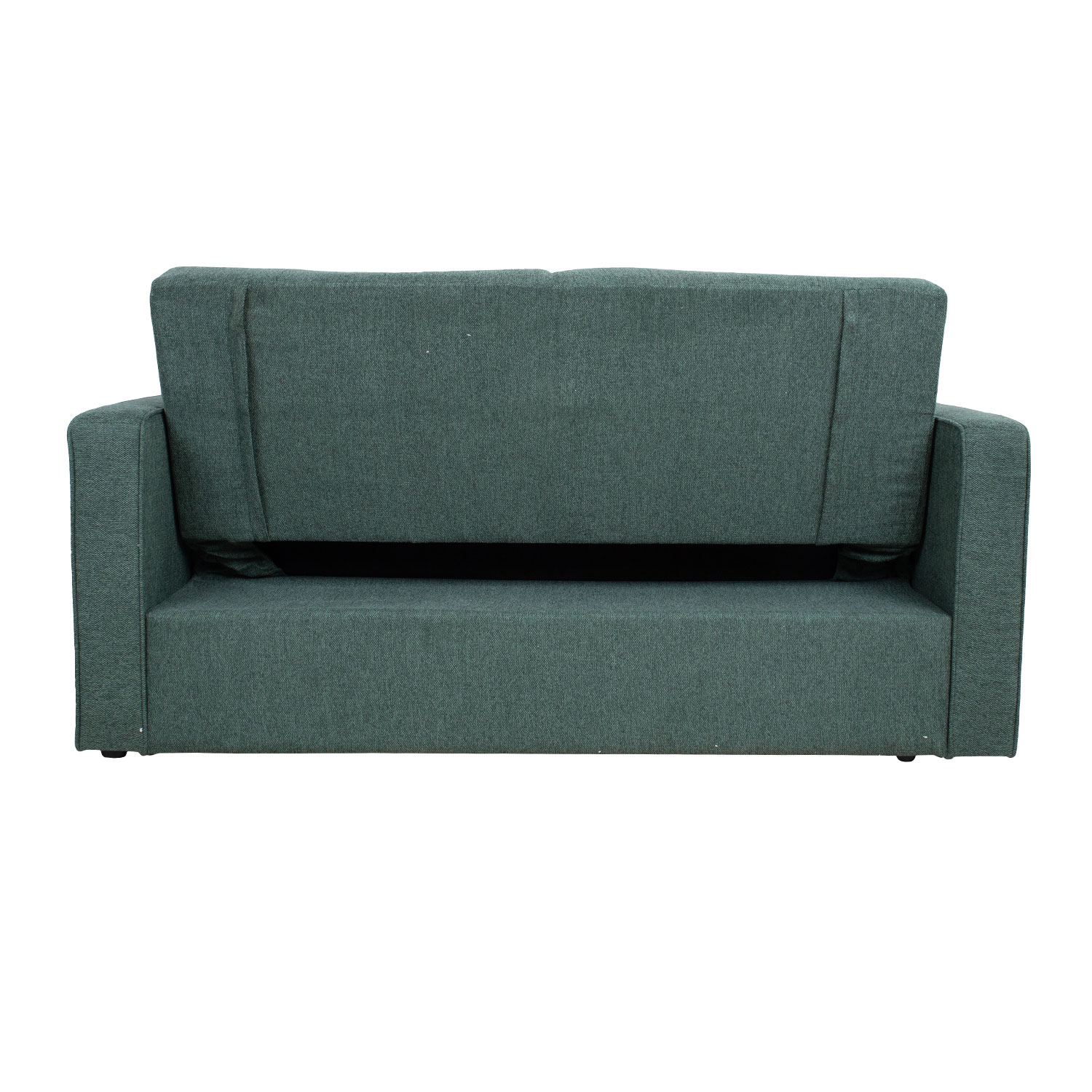 Sofa-lova JORGE 2 vietų, žalia. Sofa yra geras sprendimas, leidžiantis sukurti papildomas vietos daiktams laikyti. Norėdami atidaryti sofą, ištraukite po sėdyne esantį prailgintuvą ir pakelkite jį į tai paties lygio kaip ir sėdynę. Atlošas slankioja aukštyn ir žemyn naudojant spragtelėjimo mechanizmą ir yra užfiksuojamas trijose padėtyse. Prieš pastatydami atlošą į horizontalią padėtį, atidarykite užtrauktuku užsegamas kišenes atlošo nugarėlėje ir ištraukite metalines atramines kojeles. Sofa-lova skirta naudoti kaip svečių lova, o ne kasdieniam miegui. Visada naudokite čiužinio užvalkalą. Sofa aptraukta poliesterio audiniu. Rėmas pagamintas iš medžio masyvo. Išskleidžiamasis mechanizmas pagamintas iš metalo. Sėdynės pagrindą palaiko zigzaginės spyruoklės. Sėdynės pagalvės viduje yra kišeninių spyruoklių blokas ir porolono apmušalas. Bendrieji sofos matmenys yra 162x89x85 cm. Sėdynės plotis 136 cm, gylis 58 cm, aukštis 42 cm. Porankio aukštis nuo žemės 62 cm, porankio plotis 13 cm. Miegamojo ploto matmenys atidarius 180x136xH42 cm. Sofa turi plastikines kojas.