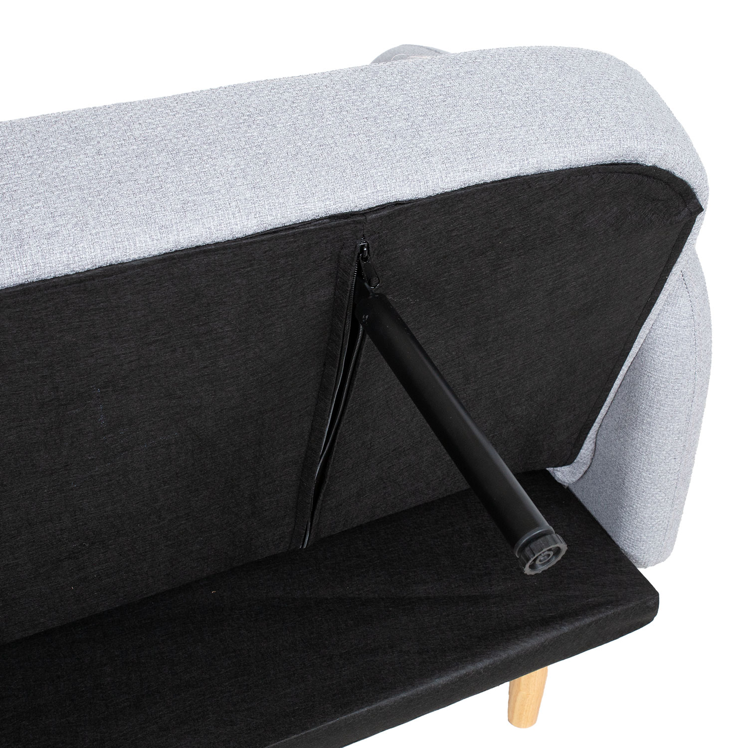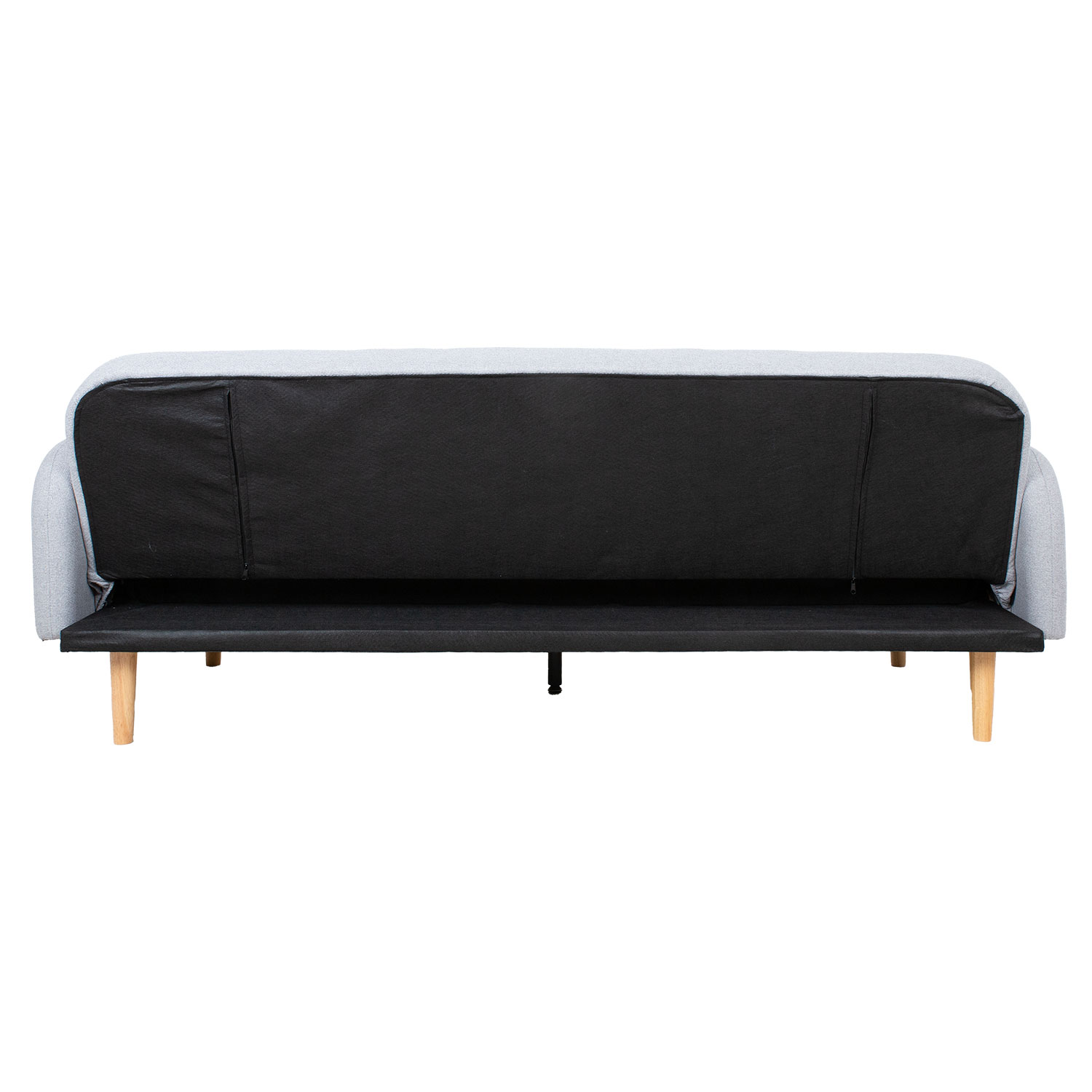 Sofa-lova KARIN 208x80x80 cm, pilka. Užvalkalo medžiaga: 100 % poliesterio audinys. Rėmas ir pakaba: mediena, fanera, MDF, zigzaginė pakaba. Sofos apmušalas pagamintas iš perdirbto porolono. Sofoje sumontuotas „click-clack” mechanizmas, todėl sofą lengva paversti miegamąja dalimi. Bendrieji sofos matmenys yra 208x80xH80 cm. Atidarytos sofos-lovos matmenys yra 187x105xH41 cm. Sofa turi šviesaus medžio kojas.