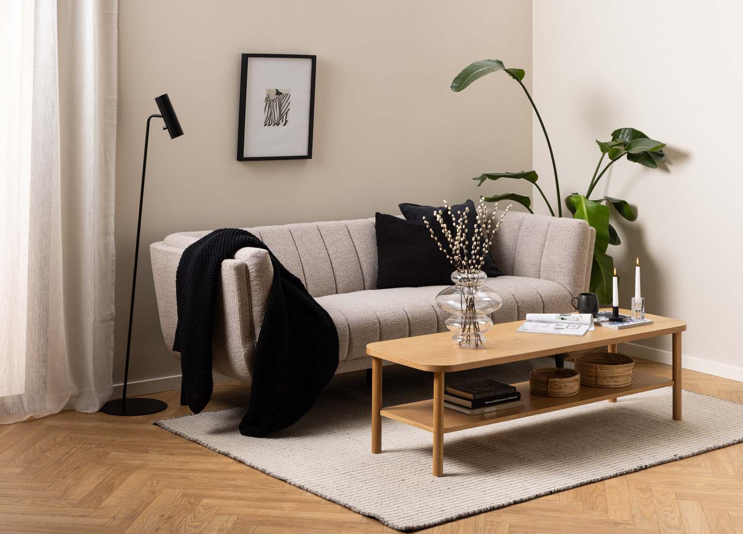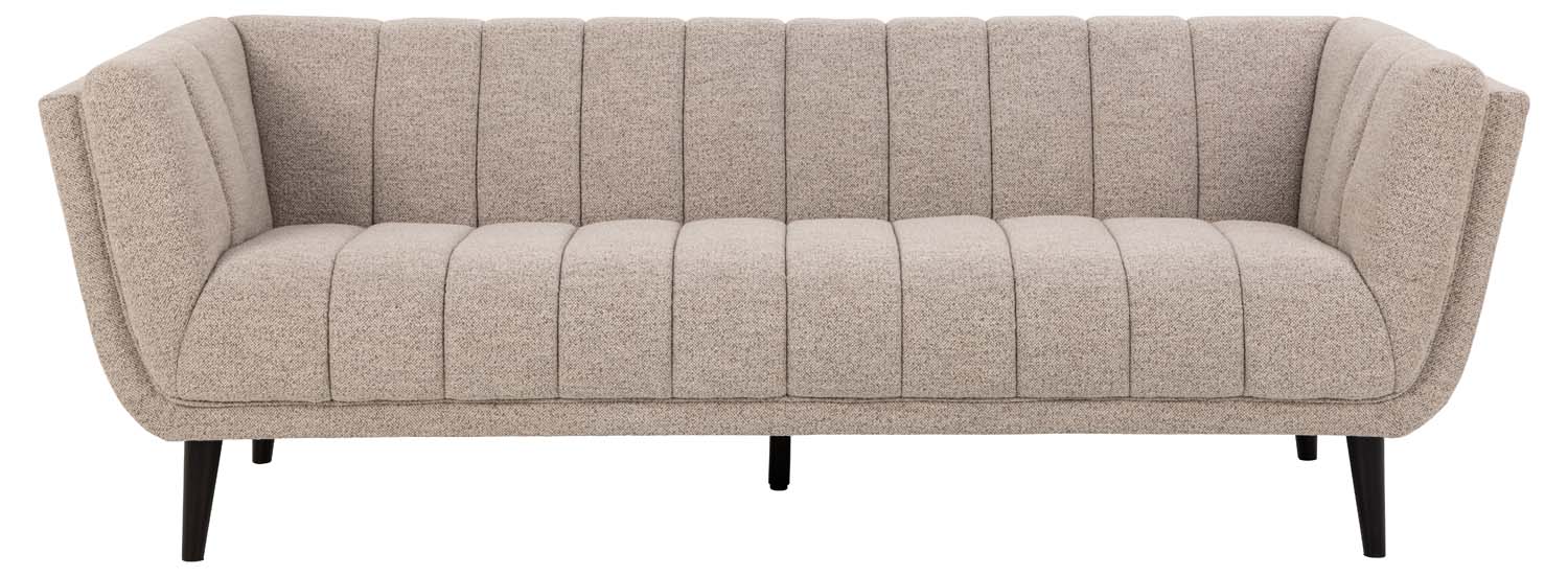 Šiuolaikinė 3 vietų sofa yra modernaus silueto. Dėl kišeninės pakabos ant jos itin patogu sėdėti. Smėlio spalvos audinys ir vertikalios siūlės suteikia dizainui elegancijos. Sofą papildo kampuotos juodos medinės kojos. Matmenys 218×86,5xH76,5 cm. PRIEŽIŪRA. Reikia atsargiai šalinti dėmes. Pirmiausia išbandykite dėmių šalinimo priemones mažiau matomoje vietoje. Niekada nenaudokite tirpiklių. Nestatykite baldų tiesioginiuose saulės spinduliuose. Pagrindas. Visas dėmes reikia nedelsiant pašalinti šluoste, sausai išskalauta muiluotame vandenyje.