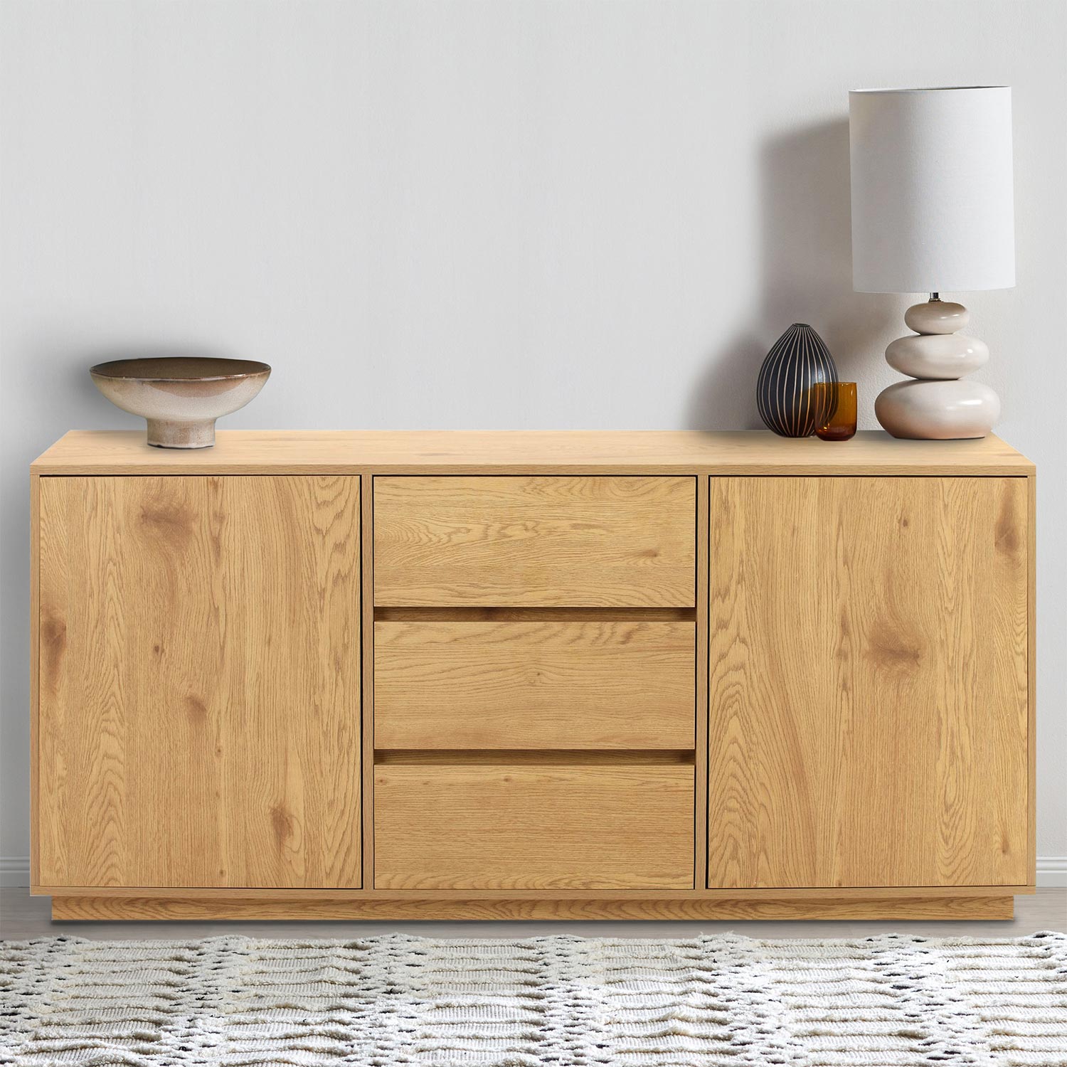 Komoda SACHA 2 durų ir 3 stalčių 160x40xH74cm, ąžuolo lukšto melamino. Spintelė pagaminta iš melamino dengtos baldinės plokštės. Stalčiai stumdomi ant metalinių šliaužiklių.