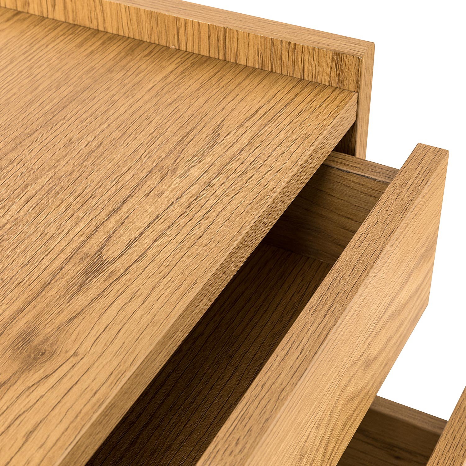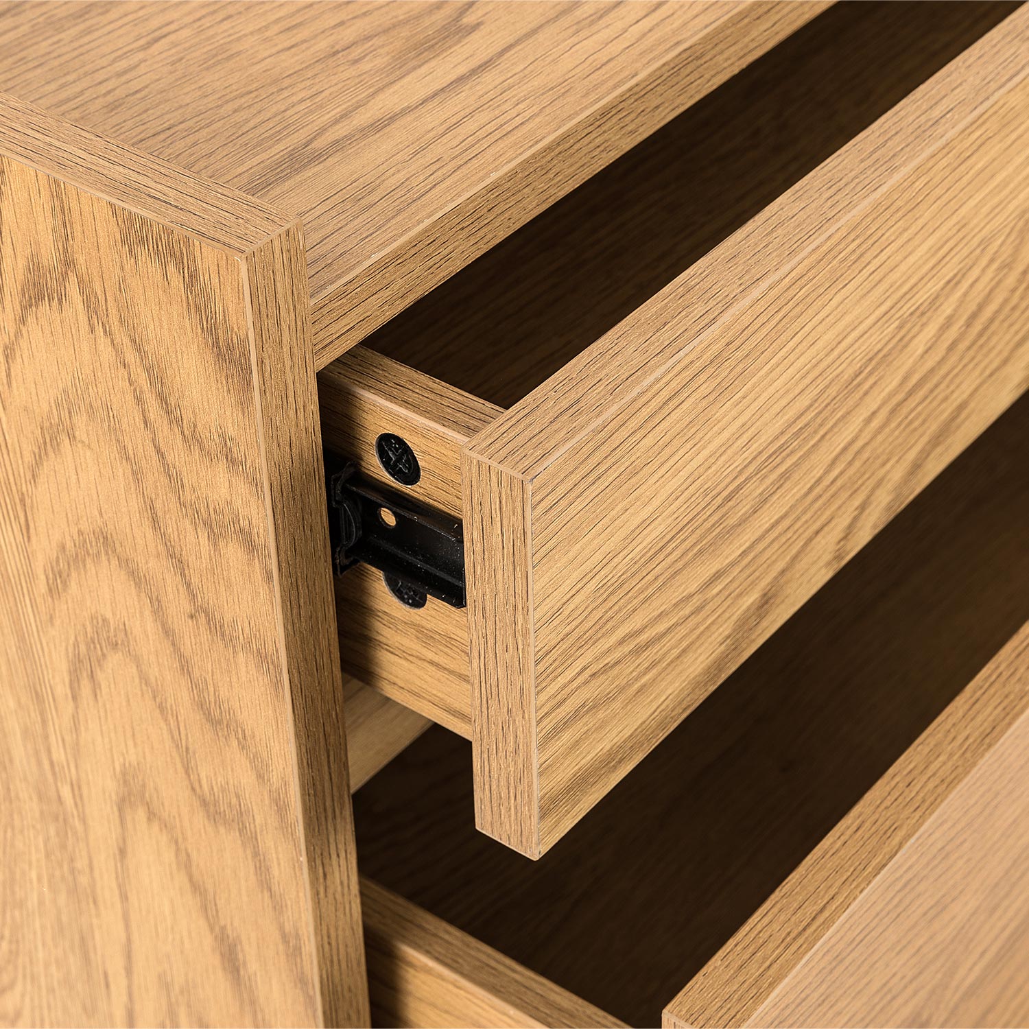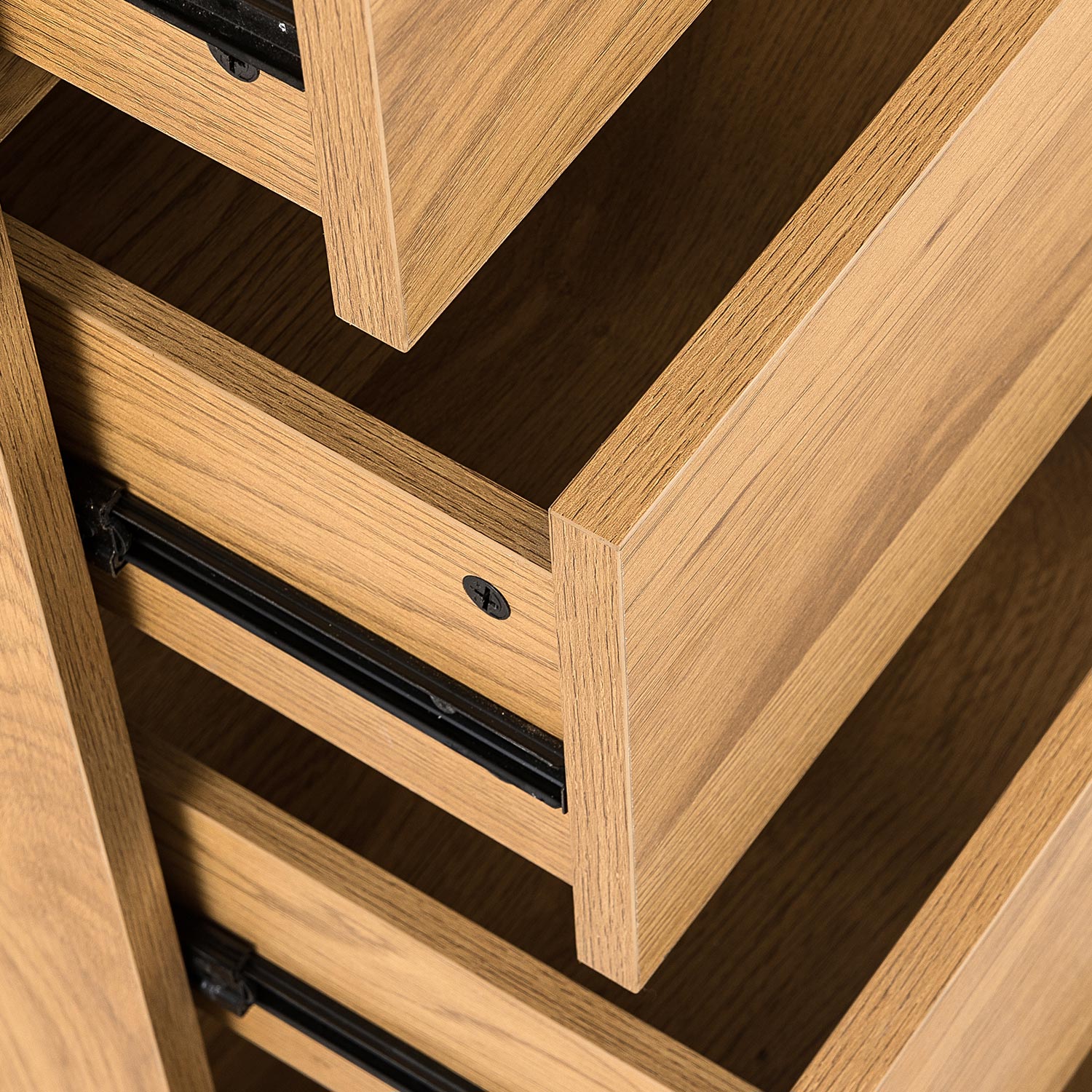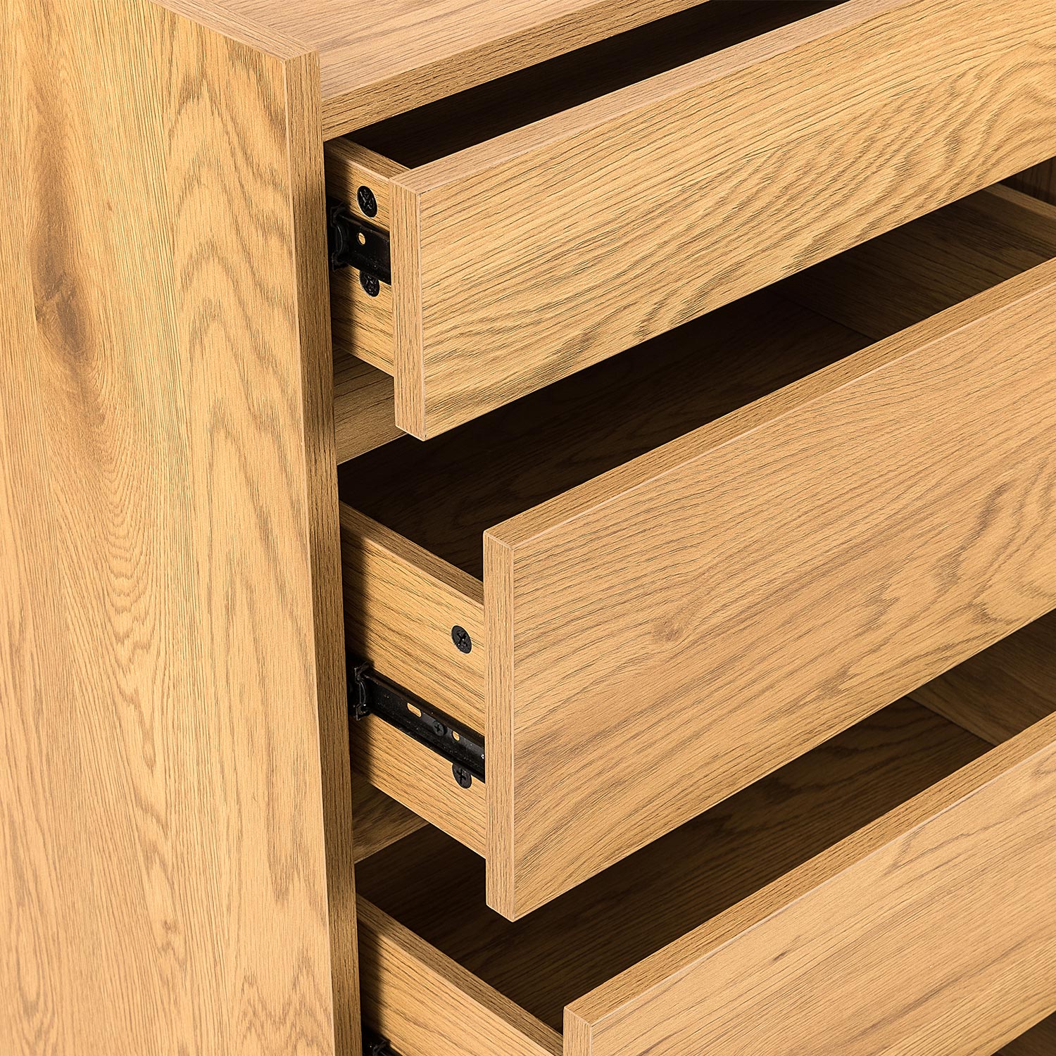 Komoda SACHA 5 stalčių 50x40xH109cm, melamino su ąžuolo stalviršiu. Spintelė pagaminta iš melamino dengtos baldinės plokštės. Stalčiai stumdomi ant metalinių šliaužiklių.