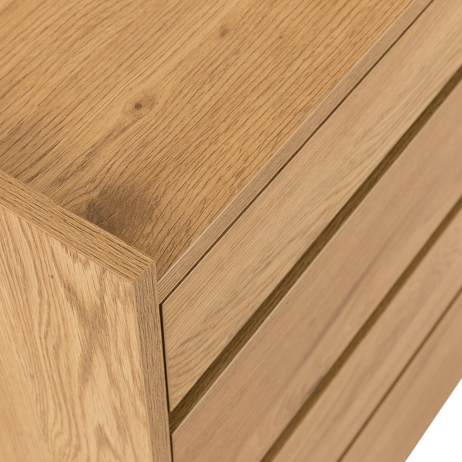 SACHA 4 stalčių 75x40xH89cm, melamino su ąžuolo stalviršiu. Spintelė pagaminta iš melamino dengtos baldinės plokštės. Stalčiai stumdomi ant metalinių šliaužiklių.