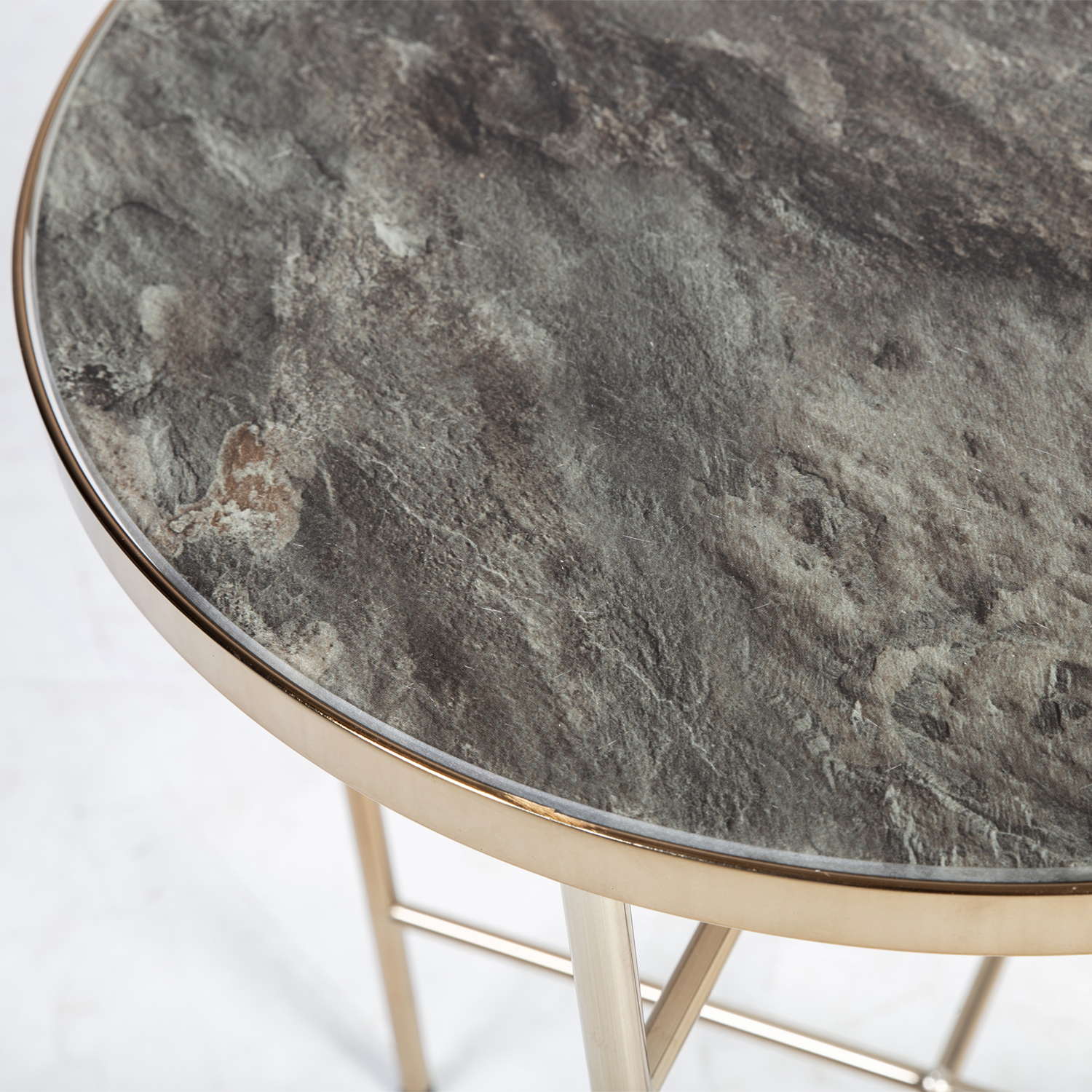 ASTORIA šoninis staliukas D42,5xH51cm. Stalviršis: 5 mm grūdintas stiklas su marmuro dekoru. Plieninės kojos ir pagrindo rėmas su blizgia ampanja apdaila.