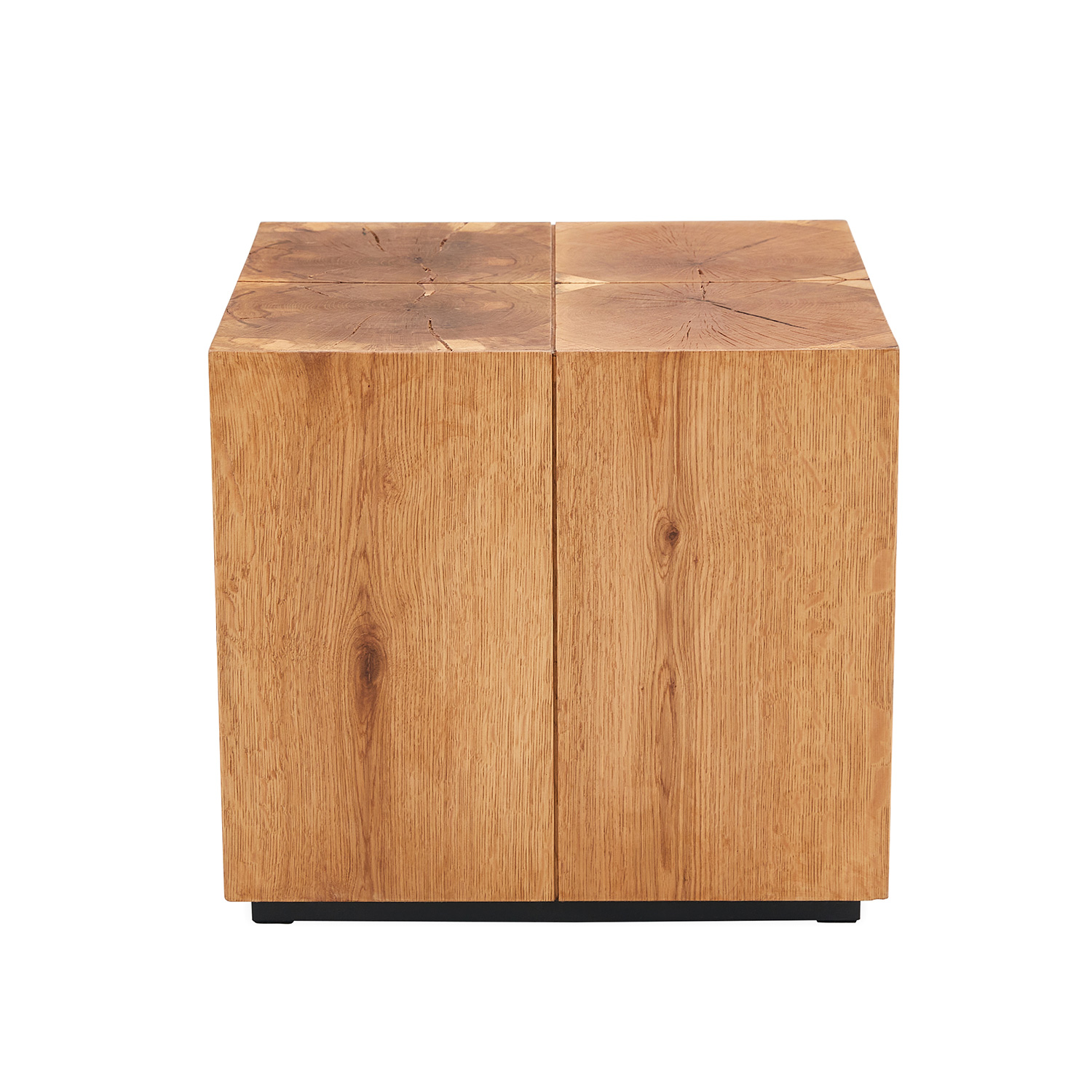 Šoninis staliukas BRONTE 50x50xH45cm, ąžuolas. Masyvus, medinės dėžutės formos šoninis staliukas, pagamintas iš MDF plokštės ir dengtas 6 mm natūralios ąžuolo faneros. Viršutinį staliuko paviršių puošia medžio šerdies pjūviai su mažais įtrūkimais, augimo žiedais ir spinduliais, kurie leidžia suprasti medžio gyvenimą. Medienos paviršius apdailintas aliejiniu vašku. Juodos spalvos plieninis pagrindo rėmas padengtas emaliu. Naudojama FSC sertifikuota mediena.