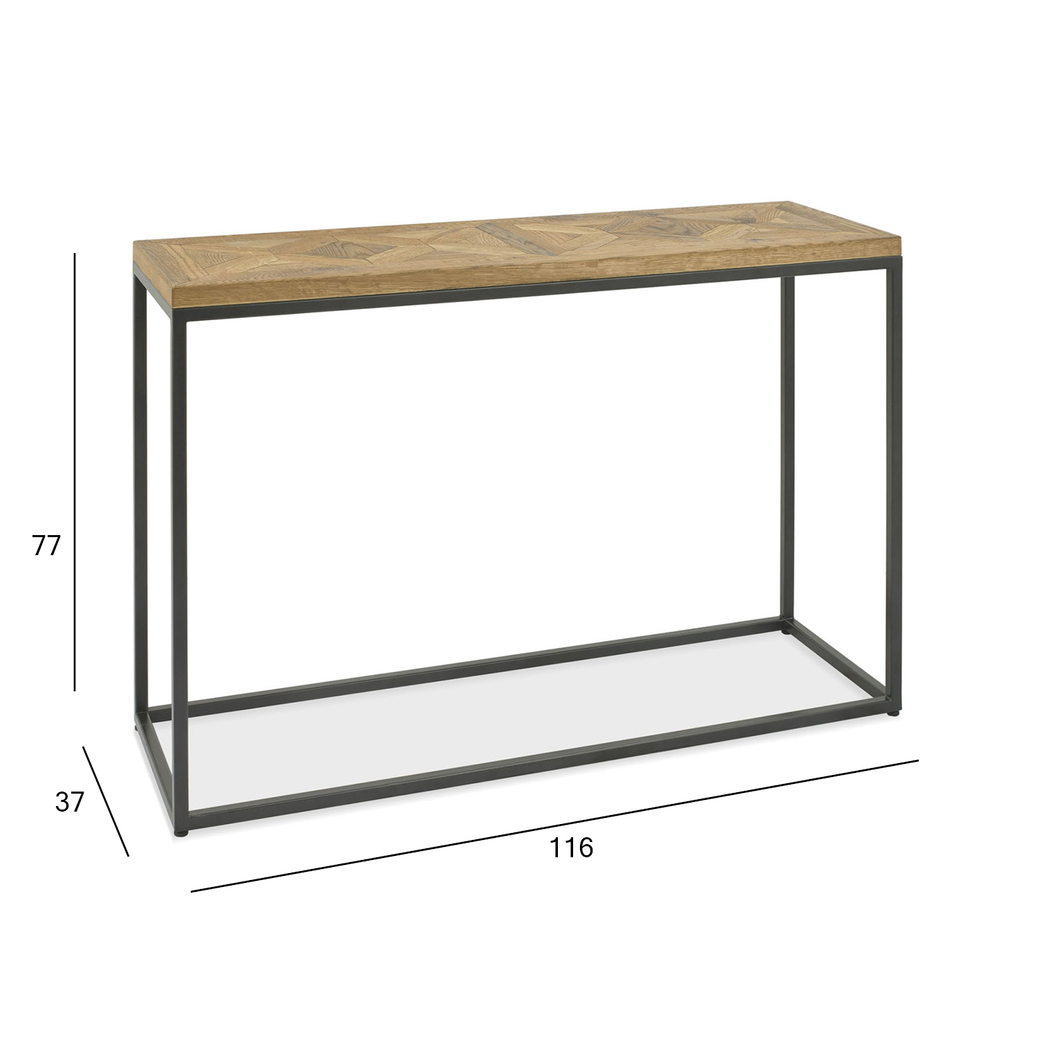 Šoninis staliukas INDUS 116x37xH77cm. Patrauklus, natūralus mozaikos ąžuolinis stalviršis su gražia šukuota ir alyvuota apdaila. Milteliais dengtas metalinis pagrindo rėmas.