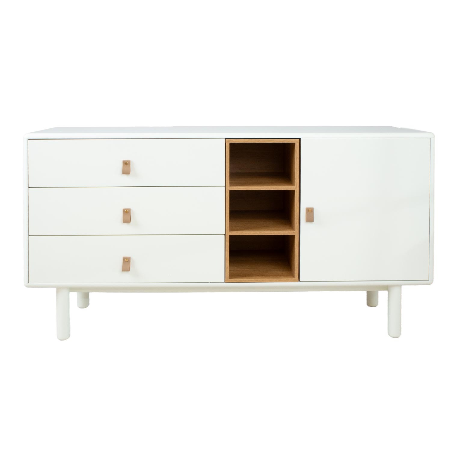 „Kumštinis IRIS” su 3 stalčiais ir durelėmis, 140x40xH75cm, baltos spalvos. Spintelė pagaminta iš 18 mm MDF plokštės. Kojos ir pagrindo rėmas pagaminti iš medžio masyvo. Apdailinta patvariais poliuretaniniais dažais. Stalčiai turi odines rankenėles. Atvira lentyna išklota šviesia medžio dėme. Spintelė turi suapvalintus išorinius kraštus.