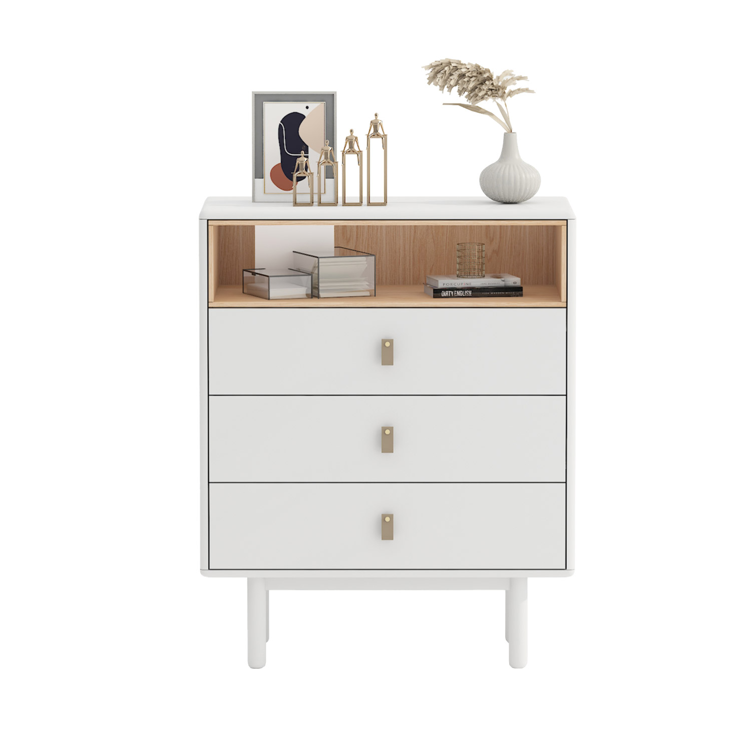 Spintelė IRIS su 3 stalčiais ir lentyna, 80x40xH100cm, balta. Pagaminta iš 18 mm MDF. Kojos ir pagrindo rėmas pagaminti iš medžio masyvo. Apdailinta patvariais poliuretano dažais. Stalčiai turi būti odines rankenas. Atvira lentyna išklota šviesiu medžio laku. Spintelė turi suapvalintus išorinius kraštus.