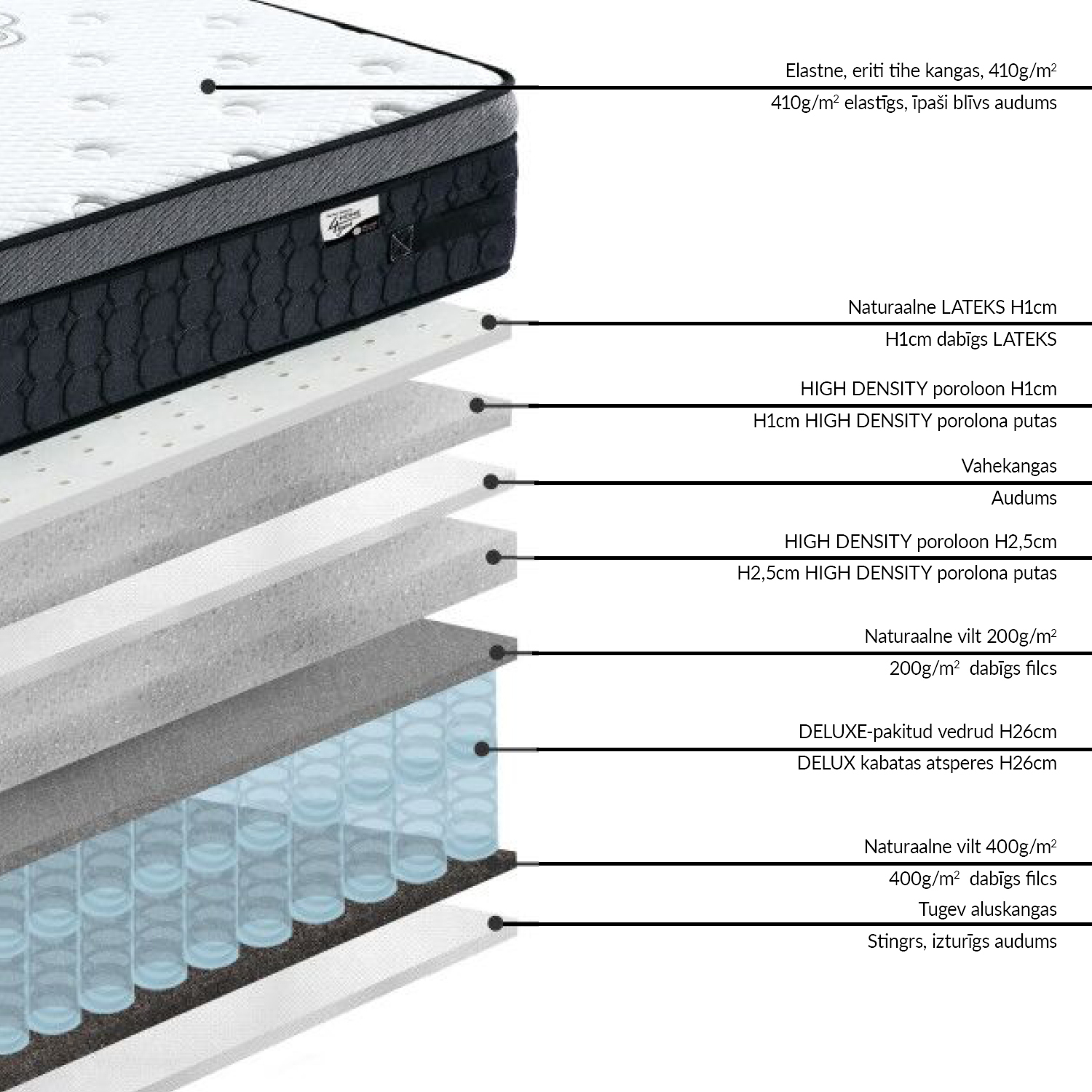 Čiužinys HARMONY DELUX 140×200 cm. PERFECT SLEEP BY HOME4YOU. Aukštos kokybės spyruoklinis 30 cm aukščio čiužinys su natūralaus latekso sluoksniu. Čiužinys turi deluxe kišenines spyruokles (2,3 mm / standus). Lengvas elastinio audinio čiužinio užvalkalas pagamintas iš odai nekenksmingos ir minkštos medvilnės ir poliesterio (audinio svoris 410 g/m2). Čiužinio viršutinis sluoksnis yra iš natūralaus latekso, kuris yra minkštas, elastingas, pralaidus orui ir savaime prisitaikantis. Be to, čiužinį sudaro du skirtingi aukštos kokybės pūkų sluoksniai, kurie užtikrina maksimalų raumenų ir skeleto atsipalaidavimą. Audinys, veltinis ir vatinas atitinka tarptautinį „Oeko-Tex 100” standartą. Čiužinys supakuotas į ritinėlį, kad jį būtų lengva transportuoti. Kad čiužinys atgautų pradinę formą, jam reikia iki 2 valandų. Atsargiai nuimkite plastikinę plėvelę ir padėkite čiužinį ant lovos. Gaminio matmenys 140x200xH30 cm.