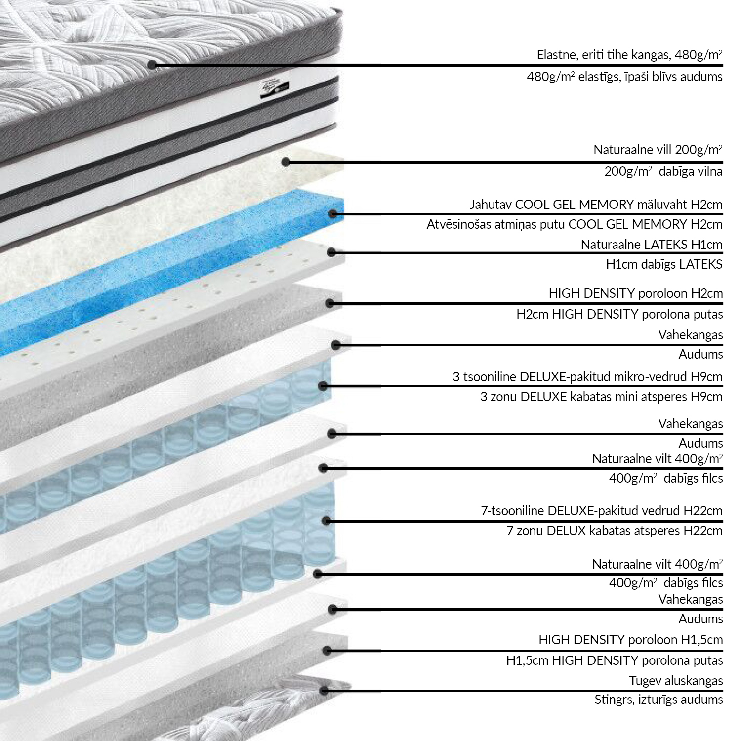 Čiužinys HARMONY DOUBLE DELUX 160x200cm. PERFECT SLEEP BY HOME4YOU. Prabangaus vidutinio standumo spyruoklinio čiužinio bendras aukštis yra 38 cm (didžiausias gaminio aukštis – 38 cm). Aukščiausią komfortą užtikrina dvigubas liukso kišeninių spyruoklių blokas, kurio viršutiniame sluoksnyje yra 3 zonų, o apatiniame sluoksnyje – 7 zonų suspaustų spyruoklių sistema. Šiuo atveju skirtingo standumo spyruoklės išdėstytos skirtingose zonose pagal žmogaus kūno poreikius. Pečių ir klubų sritis palaiko stipresnės spyruoklės, kad čiužinys per daug nesugultų. Lengvas elastinio audinio čiužinio užvalkalas pagamintas iš odai draugiškos ir minkštos medvilnės ir poliesterio (audinio svoris 480 g/m2). Po viršutiniu vilnos sluoksniu ant čiužinio yra naujas vėsinantis gelinis atminties putplastis, kurio sudėtyje esantys gelio rutuliukai padeda reguliuoti ir miego temperatūrą, ir drėgmę. Be to, čiužinys turi du skirtingus aukštos kokybės atminties putų sluoksnius, kad maksimaliai atsipalaiduotų raumenys ir skeletas. Audinys, veltinis ir vatinas atitinka tarptautinį „Oeko-Tex 100” standartą. Atsargiai nuimkite plastikinę plėvelę ir padėkite čiužinį ant lovos.