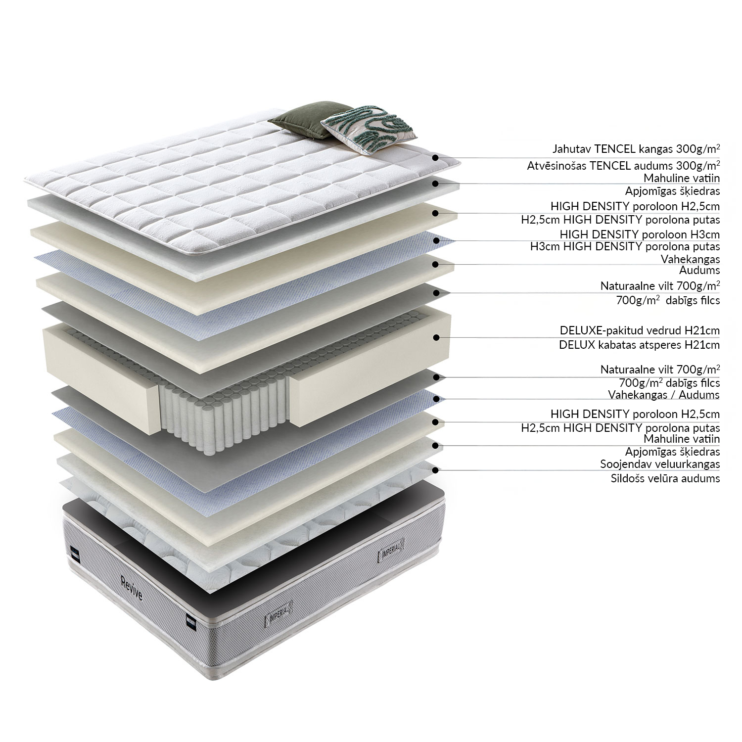 Paminkštinimas: Čiužinys paminkštintas dviem skirtingais aukštos kokybės, patvaraus porolono sluoksniais, kad maksimaliai atsipalaiduotų raumenys ir skeletas. Čiužinio šonai paminkštinti, kad būtų patogu sėdėti ant čiužinio krašto, kad čiužinio šonuose nesijaustų spyruoklių.