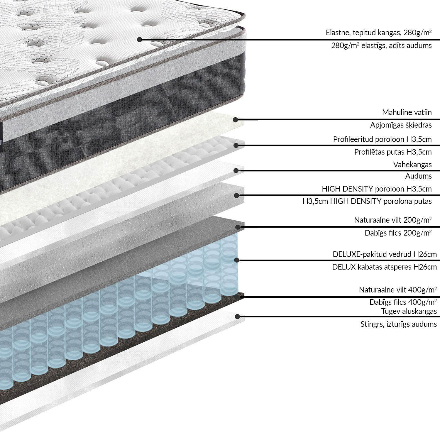 Čiužinys HARMONY TOP 120x200cm. PERFECT SLEEP BY HOME4YOU. Vidutinio standumo čiužinys su deluxe-pocket spyruoklėmis (1,9 mm / 2,2 mm kojose), padengtas veltinio sluoksniu ir 3,5 cm porolonu. Spyruoklių bloko aukštis 26 cm. Prie spyruoklinio čiužinio yra pritvirtintas užvalkalas, užtikrinantis papildomą komfortą ir poilsį. Čiužinio užvalkalas pagamintas iš aukštos kokybės 3,5 cm profiliuoto putų poliuretano, kuris praleidžia orą ir praleidžia drėgmę. Lengvas elastinio audinio čiužinio užvalkalas pagamintas iš odai nekenksmingos ir minkštos medvilnės ir poliesterio (audinio svoris 280 g/m2). Audinys, veltinis ir vatinas atitinka tarptautinį „Oeko-Tex 100” standartą. Čiužinys supakuotas į ritinėlį, kad jį būtų lengva transportuoti. Kad čiužinys atgautų pradinę formą, jam reikia iki 2 valandų. Atsargiai nuimkite plastikinę plėvelę ir padėkite čiužinį ant lovos. Gaminio matmenys 120x200xH33 cm.