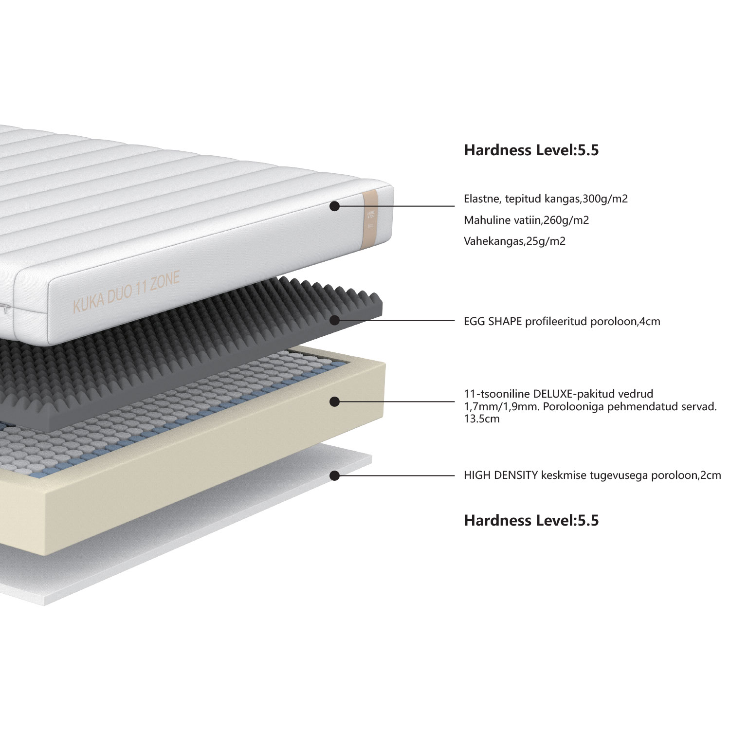 11 zonų DELUXE spyruoklės (1,7 mm/1,9 mm), aukštis 13,5 cm. 11 zonų čiužinys pritaikytas galvai, kaklui, pečiams, apatinei nugaros daliai, klubams ir kojoms palaikyti.