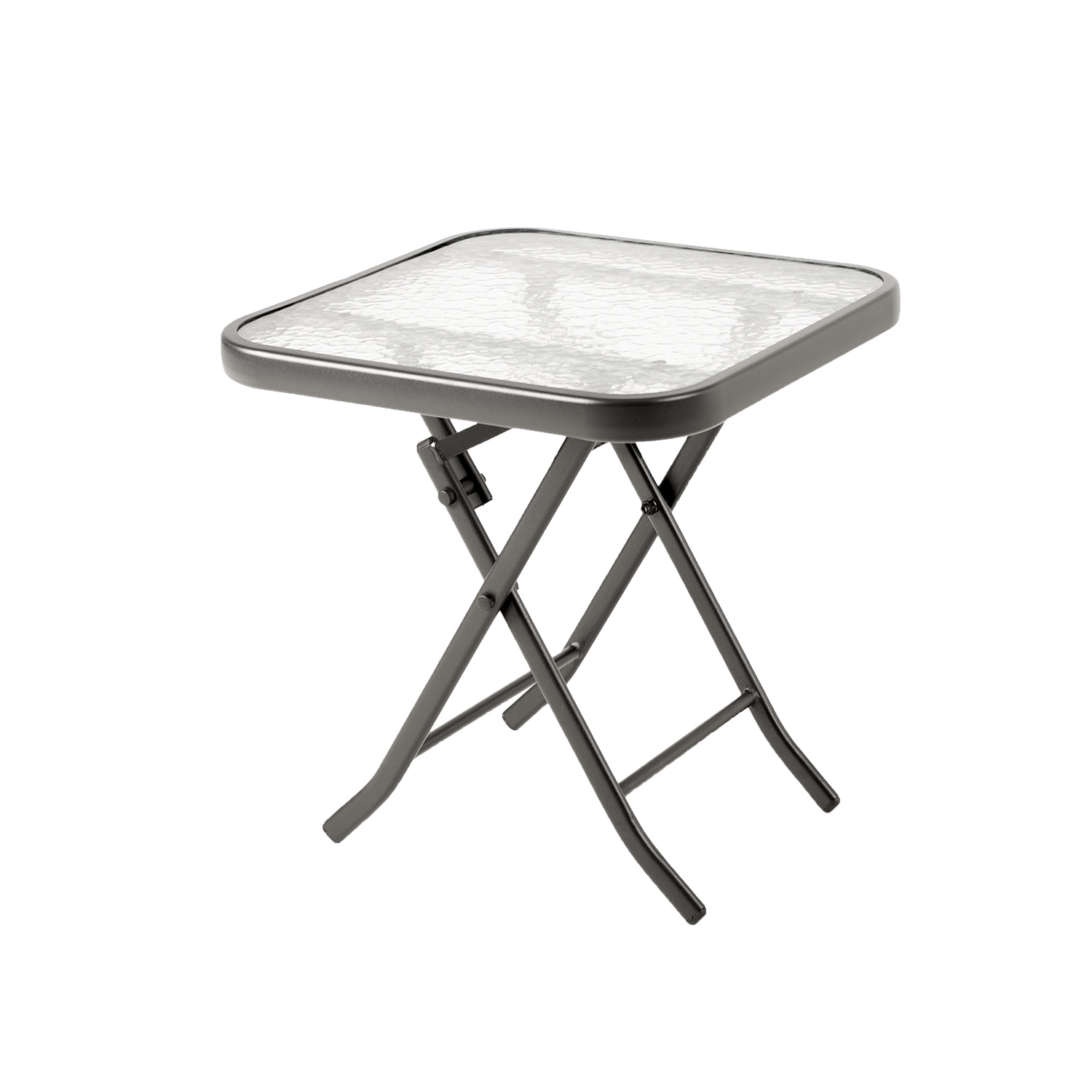 Stalas DUBLIN 46x46x46cm, sulankstomas. Stalviršis: 5 mm skaidrus banguotas stiklas. Stalo rėmas ir kojos pagamintos iš plieno ir padengtos juoda milteline danga.