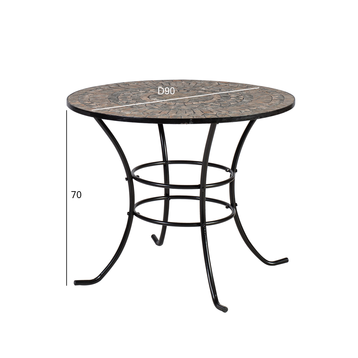 Laud MOSAIC D90xH70cm. Stalo stalviršis dekoruotas rudų ir pilkų atspalvių keraminėmis plytelėmis. Kojos ir rėmas pagaminti iš metalo ir nudažyti juoda milteline danga.
