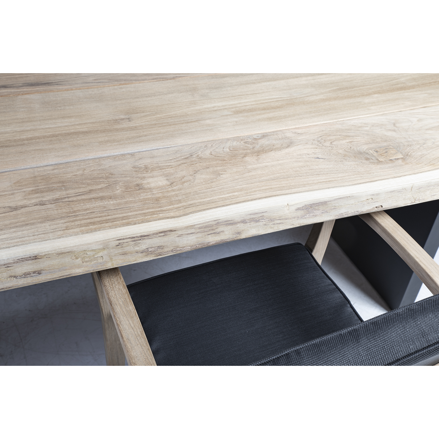 Stalas ROYAL 290x100x76cm, tikmedis. Trijų plokščių stalo stalviršis netašytais kraštais, pagamintas iš A klasės tikmedžio. Smulkiai nušlifuotas kaimiškas paviršius yra visiškai natūralus grožio, jis nebuvo alyvuotas ar kitaip chemiškai apdorotas. Stalo kojos pagamintos iš aliuminio ir padengtos pilka milteline danga. A klasės tikmedis – puiki natūrali medžiaga prabangiems lauko baldams gaminti. Mediena yra tankios ir tolygios struktūros, gražaus aksominio blizgesio, auksinių kviečių ir metonijos spalvos. Dėl didelio natūralių aliejų kiekio tikmedis yra labai atsparus drėgmei ir kenkėjams. Ji labai atspari įvairioms oro sąlygoms ir daugelį metų išlaiko puikią išvaizdą bei geriausias savybes. Saulės šviesa ir drėgmė ilgainiui stalo paviršių nudažo gražia sidabriškai pilka spalva. Šis spalvos pasikeitimas yra natūralus ir neturi įtakos medienos kokybei. Išskirtinis tvenkinio medienos stalas tinka naudoti ir patalpose. PRIEŽIŪRA: reguliariai valykite, saugokite nuo drėgmės ir UV spindulių. Jei norite, medinius paviršius galima lengvai nušlifuoti, kad jie būtų gaivesni. PRIEŽIŪRA: pasibaigus vasaros sezonui rekomenduojame sodo baldus laikyti patalpoje. Pasibaigus vasaros sezonui, prieš sandėliuojant baldus patartina palikti juos sode, kad atvėstų ir išdžiūtų. Sandėliavimui naudokite sausą ir gerai vėdinamą patalpą.