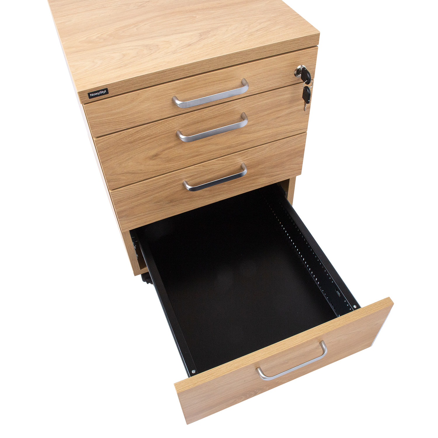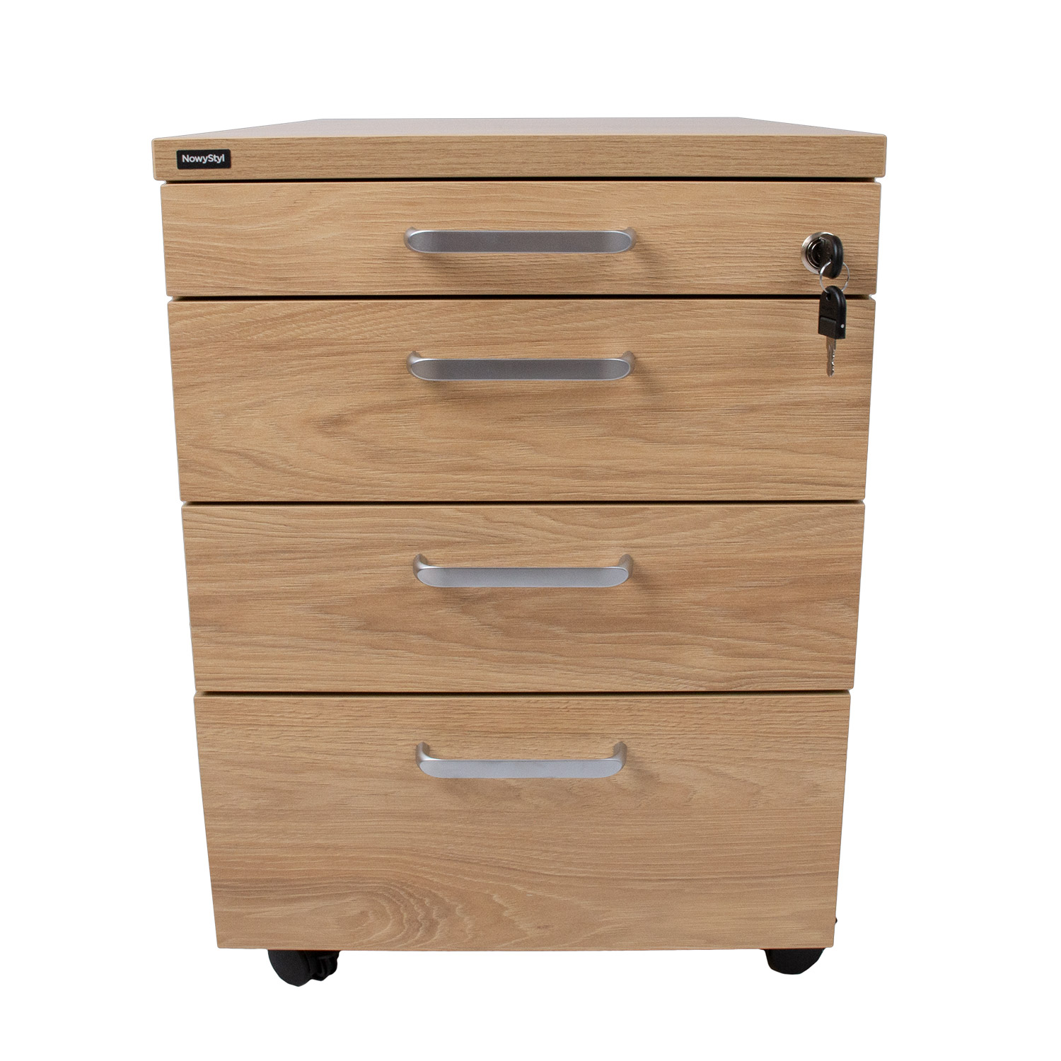 Stalčių dėžė ERGO 60x43xH60cm, hikorio. ERGO biuro baldai – tai estetiškas funkcionalumo ir paprasto dizaino derinys. Asortimentą sudaro įvairūs gaminiai, kuriuos galima lengvai derinti ir sukurti idealią darbo aplinką tiek dideliems, tiek mažiems biurams ar darbui namuose. Baldai pagaminti iš 18/25 mm melamino dengtos baldinės plokštės, atitinkančios E1 standartą (formaldehido emisija: = 0,5 mg/l). Melamino plokštę galima rinktis iš įvairių spalvų, kad būtų galima sukurti įvairius derinius. Norėdami pateikti specialų užsakymą, kreipkitės į mūsų pardavėjus dėl pasiūlymo. Talpios ir praktiškos stalčių dėžutės korpusas pagamintas iš 25 mm storio melamino plokštės. Keturi metaliniai rakinami stalčiai sklandžiai slankioja ant metalinių šliaužiklių ir užsidaro automatiškai. Viršutiniame stalčiuje yra plastikinis pagrindas, skirtas biuro reikmenims tvarkyti. Užrakinamais ratukais stalčių dėžę galima lengvai perkelti ir saugiai pritvirtinti. Gaminio matmenys 60x43xH60 cm.
