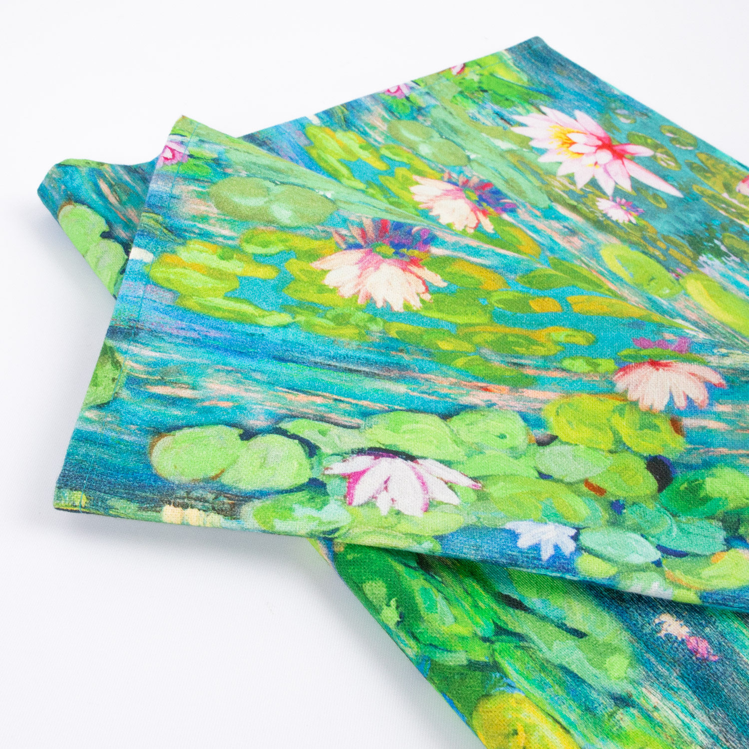 Pledas HOLLY 43x116cm, rožinės vandens lelijos. Medžiaga: 100% medvilnė, audinys 315. PRIEŽIŪRA: galima skalbti skalbyklėje 30° temperatūroje.
