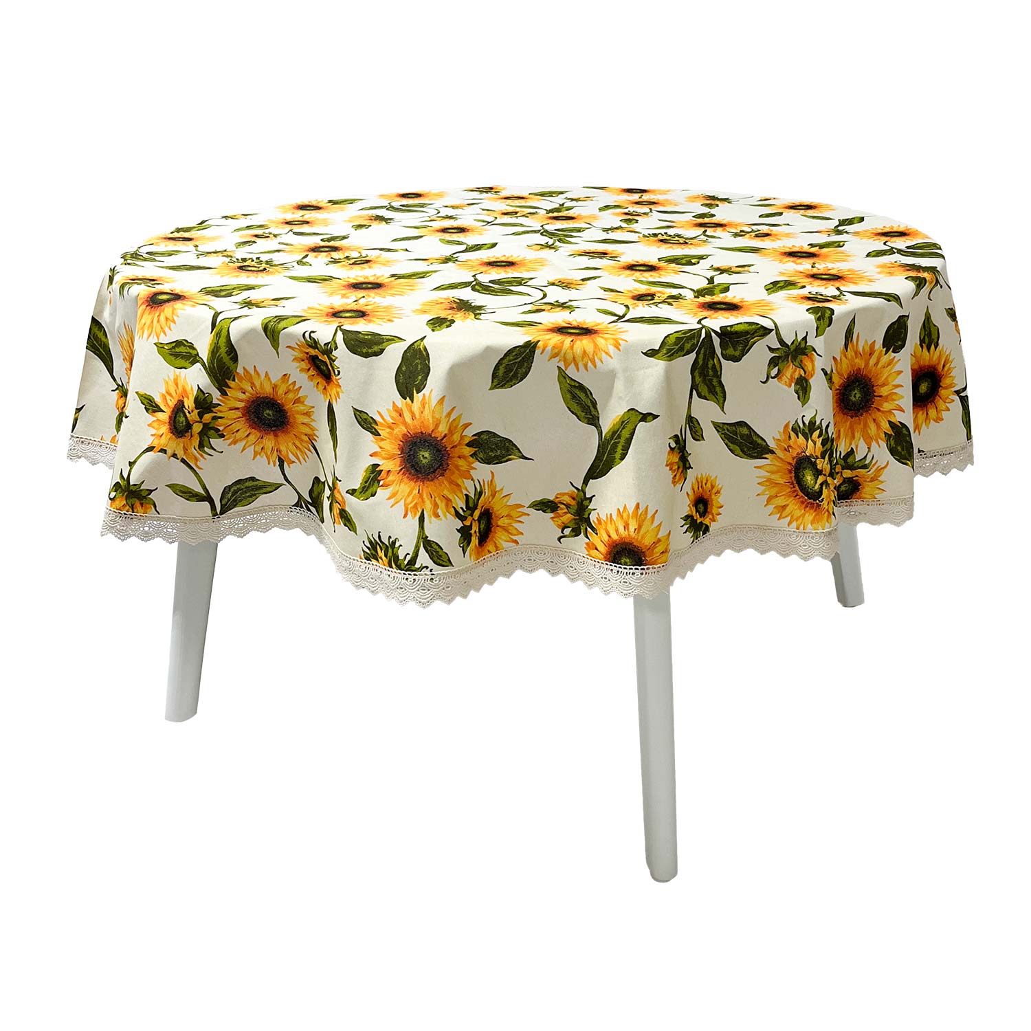 Staltiesė LONETA NAUJIENA su nėriniais, D170cm, saulėgrąžos. 50 % poliesteris, 50 % medvilnė, audinys 424. PRIEŽIŪRA: galima skalbti skalbyklėje 30 laipsnių temperatūroje.