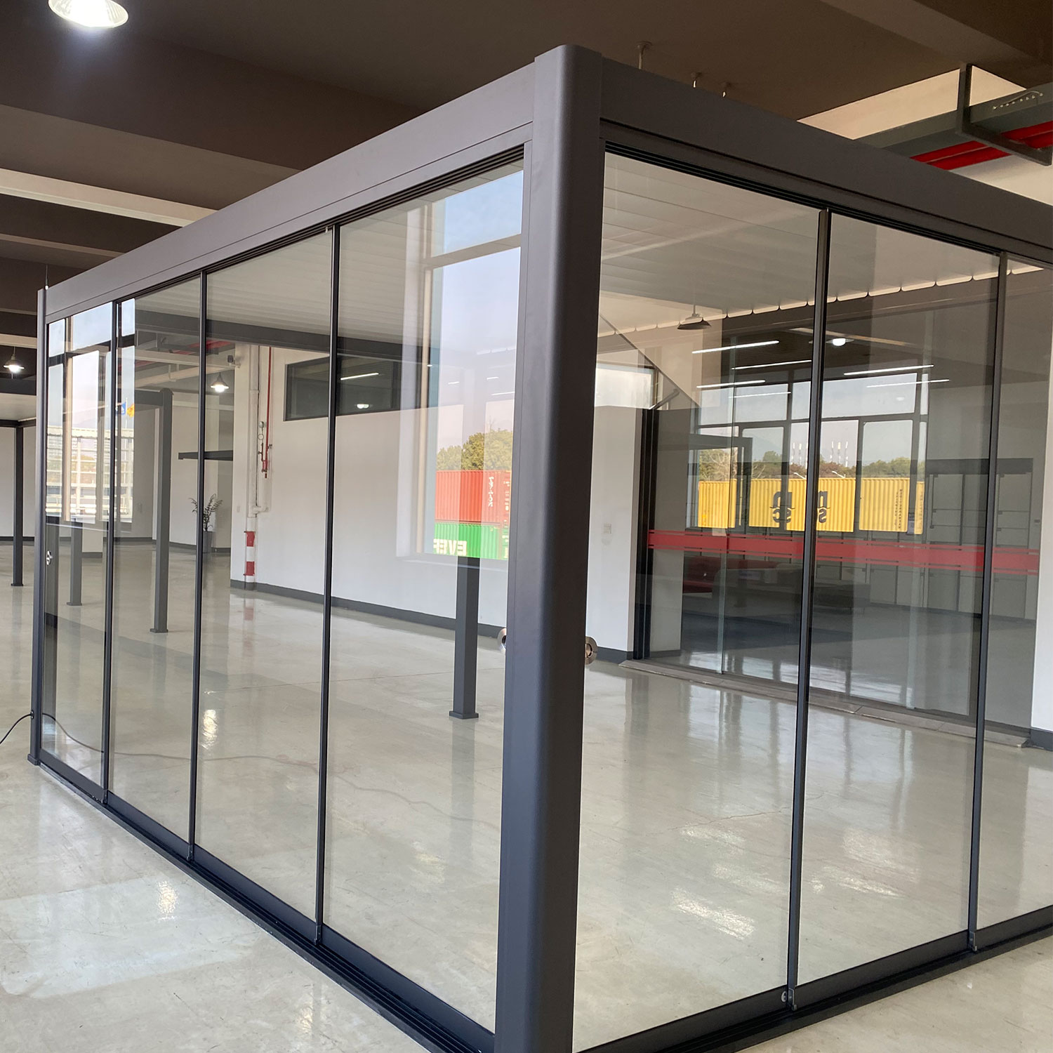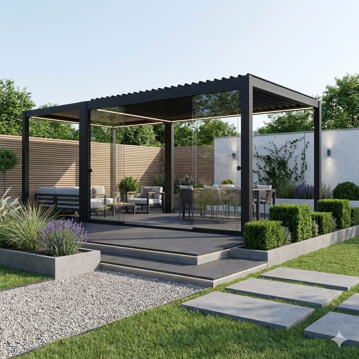 Stiklo stumdomoji sienelė 3 metrų pavėsinės MIRADOR-111 pusėje.
