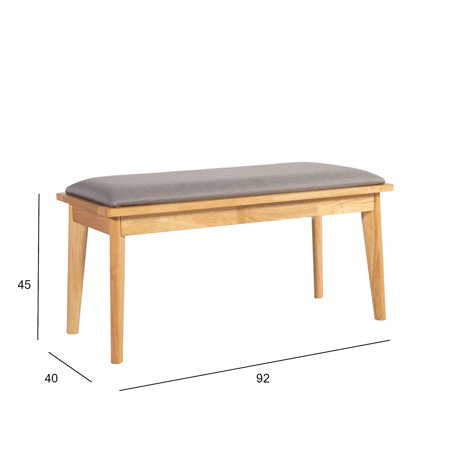 Rožinė JONNA 92x40xH45cm. Suoliukas turi lengvai minkštą sėdynę, aptrauktą pilku poliesterio audiniu. Kojos ir karkasas pagaminti iš kaučiukmedžio ir apdailinti ąžuolo laku.