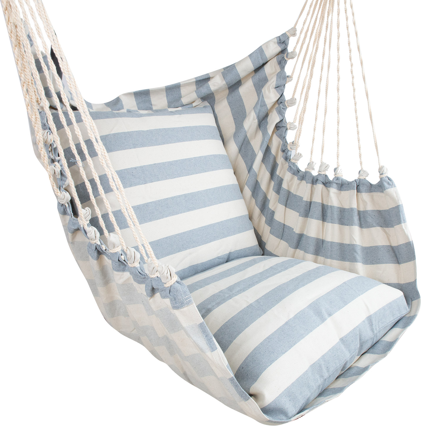 COPENHAGUE pakabinama kėdė su pilkais dryžiais. Šį pakabuką rankomis gamina Salvadoro amatininkai, laikydamiesi tvarios žiedinės ekonomikos principų ir taip gerindami socialinį teisingumą bei vietos žmonių gyvenimo kokybę. Naudojama medžiaga – tekstilė, pagaminta iš perdirbtų pluoštų, gautų panaudojant vietos drabužių gamyklų atraižas. Šiame procese nenaudojamos cheminės medžiagos, dažai, o vandens ir energijos sunaudojama minimaliai. Medžiagoje nėra sintetinių pluoštų ir ji yra 100 % ekologiška. Komplekte yra du minkšti čiužiniai. Sūpynes galima pakabinti ant tvirtos medžio šakos ar sijos. Taip pat sūpynes galima pakabinti naudojant nešiojamąjį stovą. Supynės matmenys yra 130×127 cm, o bendras ilgis – 137 cm. Medinio pakabinamo stulpo ilgis yra 112 cm. Bendras pakabinamo krėslo svoris yra 120 kg. PRIEŽIŪRA: Norėdami prailginti gaminio tarnavimo laiką, saugokite jį nuo oro sąlygų. Norėdami prailginti gaminio tarnavimo laiką, saugokite jį nuo saulės ir lietaus. Nepalikite supamojo krėslo ilgą laiką lauke be saulės spindulių ar pernelyg didelės drėgmės poveikio. Jei įmanoma, po naudojimo pakabintą kėdę pakelkite ir laikykite sausoje, gerai vėdinamoje patalpoje. Prieš sandėliuojant leiskite supynėms visiškai išdžiūti. Supamąjį krėslą galima skalbti rankomis vandenyje iki 40 laipsnių pagal Celsijų. Naudokite tik švelnias skalbimo priemones.