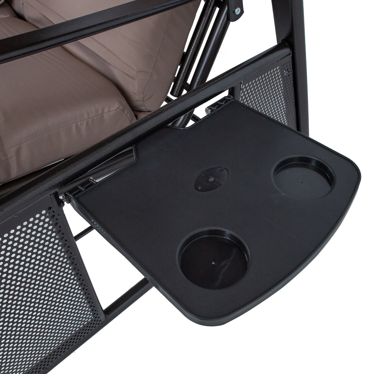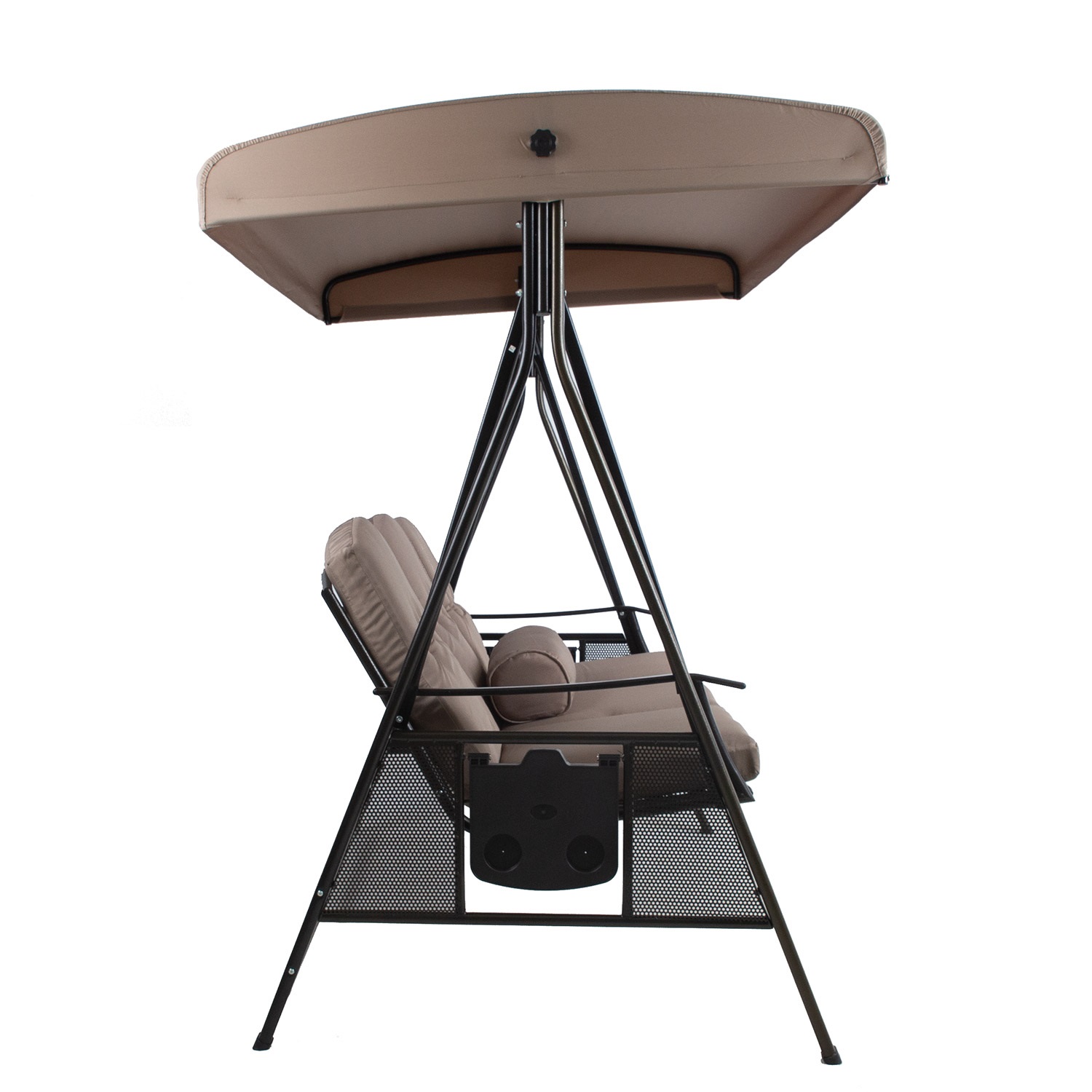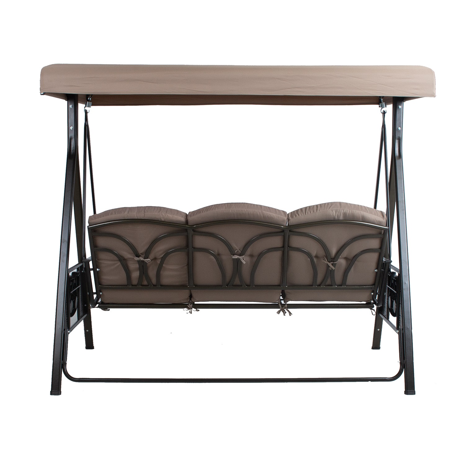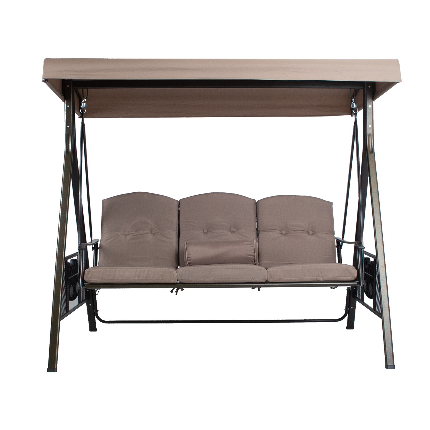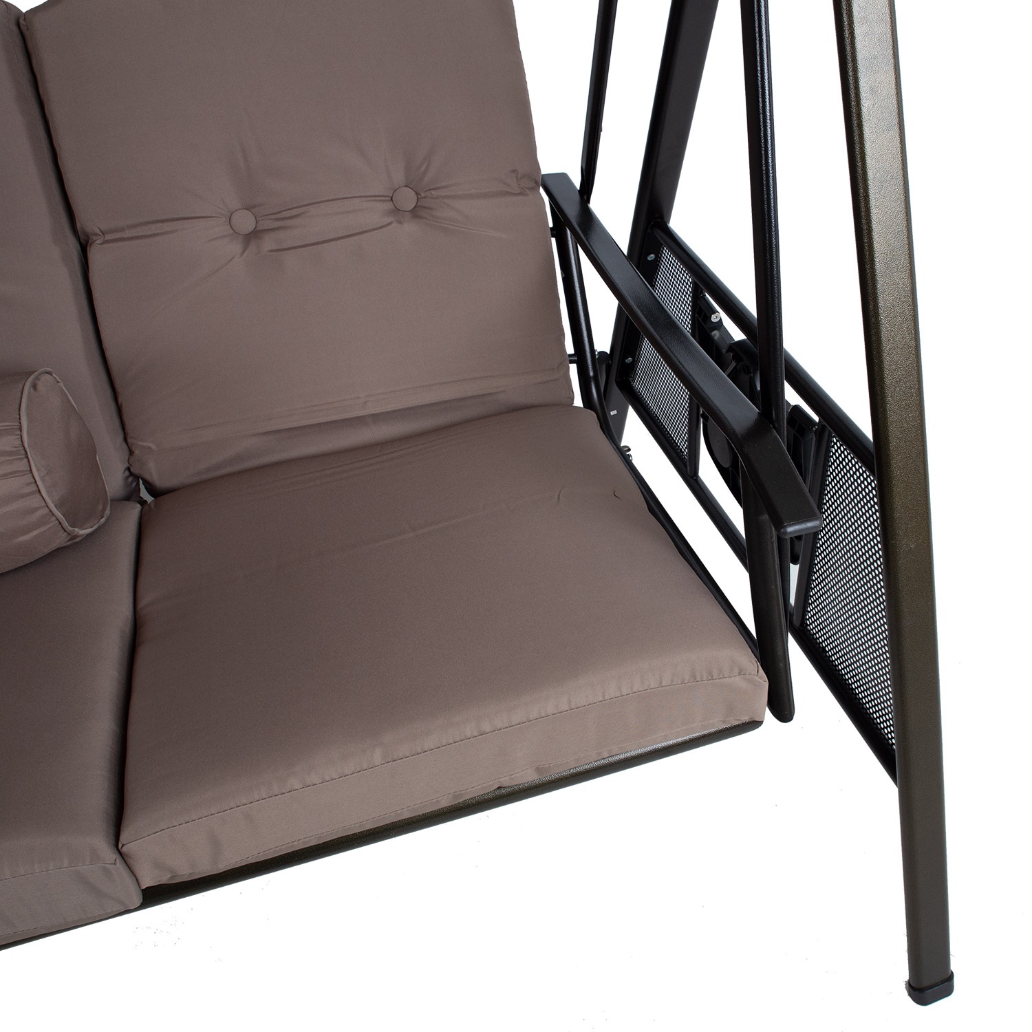 Sūpynės FRANCO 3 sėdimų vietų 200x112xH178cm, rudos spalvos. Šios sodo sūpynės su baldakimu ir minkštomis pagalvėlėmis yra puikus būdas atsipalaiduoti lauke. Kiekvienoje sūpynių pusėje yra nedidelis atlenkiamas staliukas. Sūpynės rėmas ir sėdynė pagaminti iš plieno ir nudažyti rudais milteliniais dažais. Stogelio kampas reguliuojamas. Pagalvėlės ir stogelis pagaminti iš rudos spalvos poliesterio audinio (250 g/m²). Pagalvėlės nuimamos. Pagalvių storis 8 cm. Sėdynės plotis 160 cm, sėdynės aukštis 58 cm (matuojant su pagalvėmis), sėdynės gylis 51,cm. Ribinis svoris 250 kg. Gaminys labai patvarus kintamomis oro sąlygomis, jį lengva prižiūrėti. Rekomenduojame naudoti lauko užvalkalus, kad pailgintumėte sūpynių tarnavimo laiką. PRIEŽIŪRA: pasibaigus vasaros sezonui, rekomenduojame sodo baldus laikyti patalpoje. Jei vasaros sezonui, rekomenduojame palikti baldus sode žiemos mėnesiais. Sandėliavimui naudokite sausą ir gerai vėdinamą patalpą.