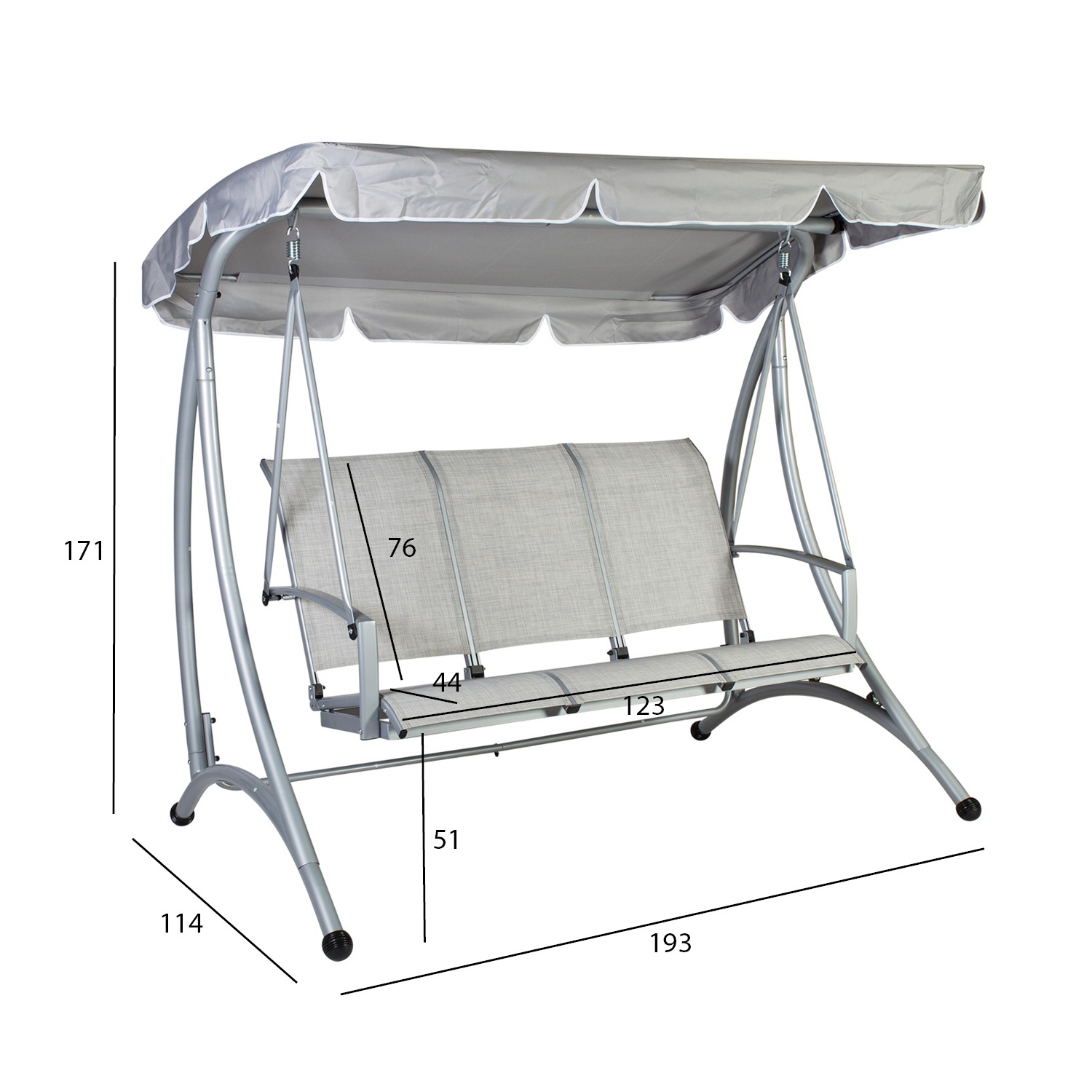 Sūpynės MAIRY pilkos spalvos. Sodo sūpynės suteikia galimybę maloniai mėgautis grynu oru ir ilgais vakarais lauke. Trijų vietų sūpynių sūpynių sėdynė padengta tekstiline medžiaga, kuri yra patvari ir lengvai valoma. Stogelis pagamintas iš poliesterio audinio, o rėmas – iš plieno. Sūpynės yra 193x114xH171 cm dydžio, o jų leistinas svoris – 240 kg. ĮSPĖJIMAS: gaminys neskirtas naudoti esant stipriam vėjui ir lietui.