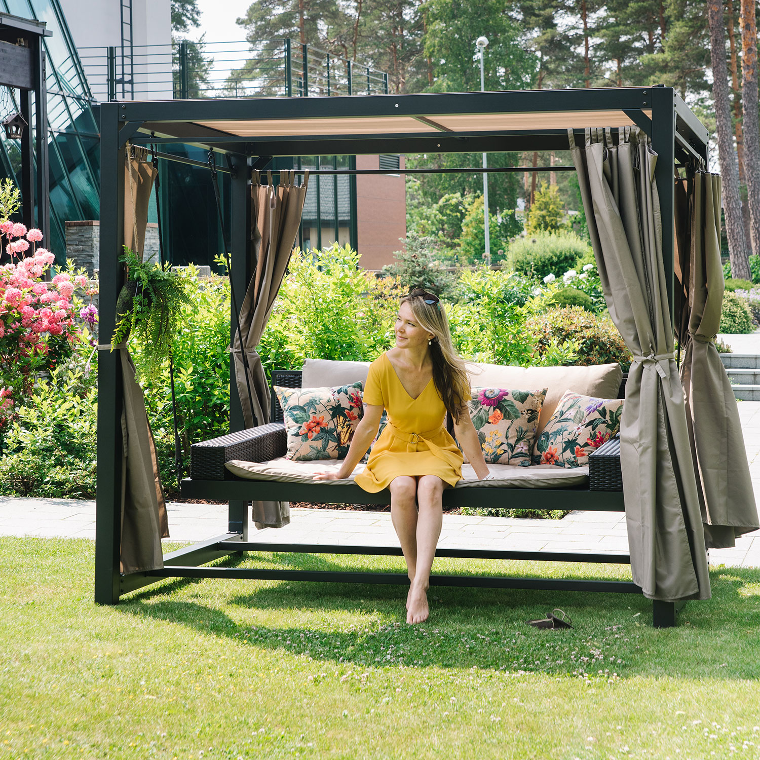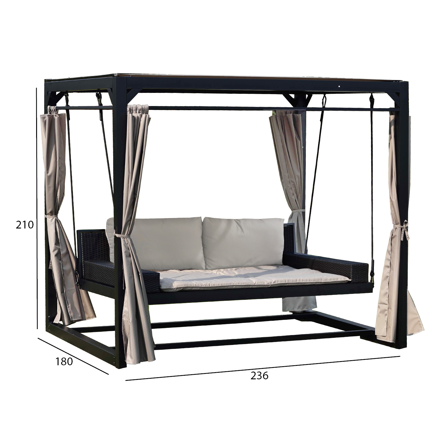 Sūpynės BARCELONA rudos spalvos 236x180xH210cm, rudos spalvos/bee˛. Mėgaukitės vasara ir atsipalaiduokite neišeidami iš namų! Modernaus dizaino erdvios sodo sūpynės puikiai papildys įprastus sodo baldus. Tvirta pagrindinė sūpynių konstrukcija pagaminta iš plieno ir nudažyta tamsiai rudos spalvos milteliniais dažais. Poliesterio audeklo stogas ir šoninės užuolaidos suteikia malonų pavėsį nuo saulės. Sėdynės pagrindas pagamintas iš tekstileno, kuris užtikrina gerą oro cirkuliaciją, greitai džiūsta ir yra lengvai prižiūrimas. Sėdynės atlošas ir porankiai aptraukti rudos spalvos plastikiniu pynimu. Į komplektą įeina 2 minkštos atlošo pagalvėlės 80x46x18 cm ir pagrindo čiužinys 156x134x4 cm. Pagalvėlių ir čiužinio užvalkalai pagaminti iš poliesterio audinio. Plieninio rėmo atraminio stulpelio matmenys 80×80 mm. Sūpynės sėdynės gabaritiniai matmenys yra 195x134xH48 cm, porankio plotis – 16 cm, vidiniai sėdynės matmenys – 156×130 cm, sėdynės aukštis nuo žemės – 54 cm. Svorio riba – 200 kg. Gaminys labai patvarus kintamomis oro sąlygomis, jį lengva prižiūrėti. Tik pagalvėles ir baldakimą reikia apsaugoti nuo atmosferos poveikio. Rekomenduojame naudoti lauko baldų užvalkalus, kad prailgintumėte lauko baldų tarnavimo laiką. Sūpynėms BARCELONA galima įsigyti specialų užvalkalą, kodas 13250. Smarkaus lietaus atveju pasirūpinkite, kad ant stogelio nesikauptų per daug vandens. PRIEŽIŪRA: pasibaigus vasaros sezonui, rekomenduojame sūpynes išardyti ir laikyti sausoje ir gerai vėdinamoje patalpoje.