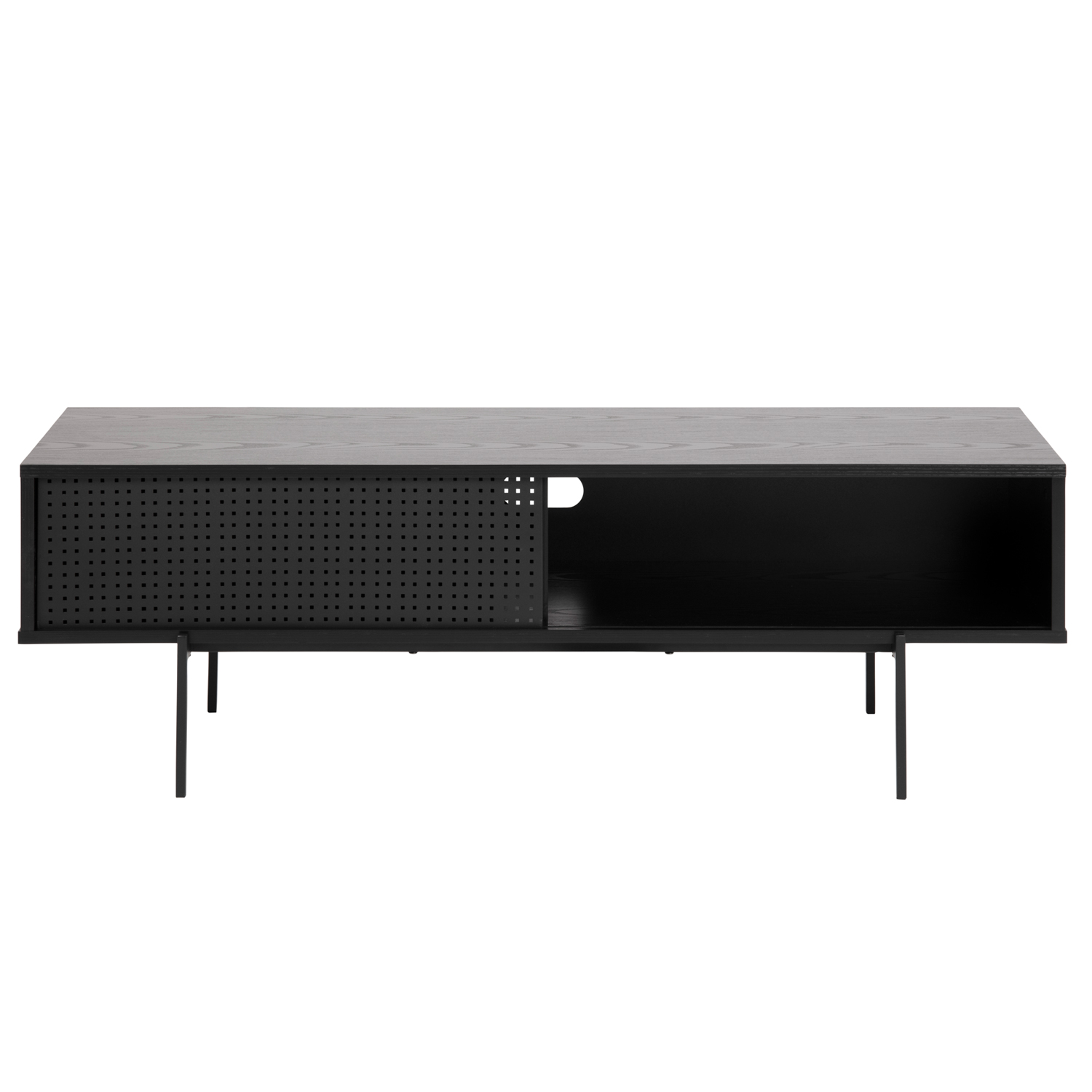 TV staliukas ANGUS 140x40xH44cm. Švarių linijų ir juodos salos išvaizdos TV staliukas moderniai papildys bet kurią gyvenamąją erdvę. TV staliuką laiko milteliniu būdu dengtos metalinės kojos. Durelių dizainas suteikia stilingumo, o už jų yra daug vietos daiktams laikyti. Stalviršis: juodas salos melaminas, rėmas: metalinis, juodas. PRIEŽIŪRA: Melamino paviršiams paprastai nereikia daug priežiūros. Naudokite šluostę, ištrintą muiluotu vandeniu, ir sausai nuvalykite paviršių. Venkite naudoti šveitimo miltelius ar nailonines pirštines, nes jie balina arba braižo laminatą. Netrinkite paviršiaus kietais daiktais.