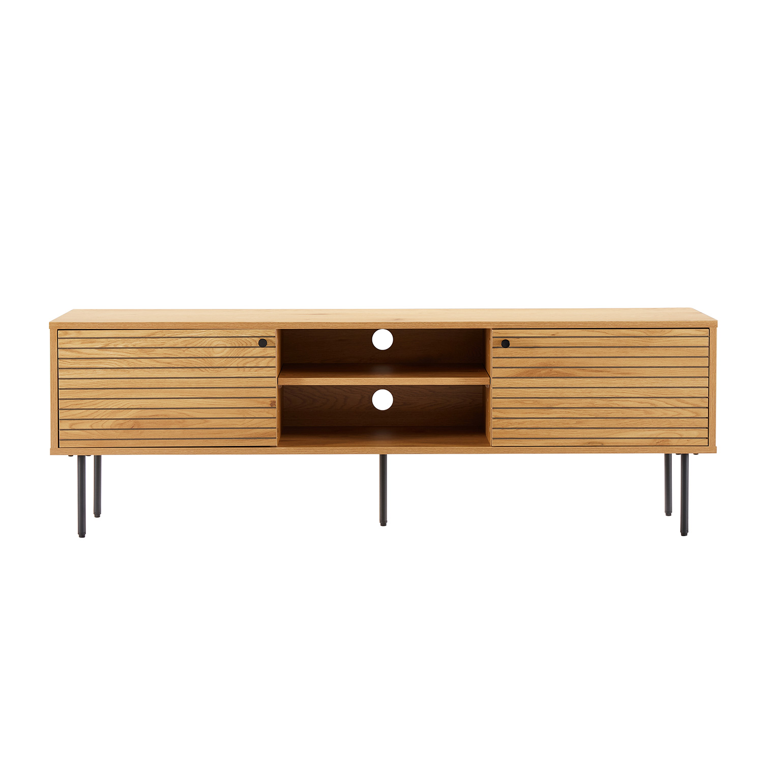 TV staliukas LINE su 2 durelėmis ir lentynomis 150x40xH50cm. Televizoriaus staliukas pagamintas iš melamino viršaus su ąžuolo lukštu. Patrauklios dryžuotos durelės su reljefiniu paviršiumi pagamintos iš juodos MDF plokštės, dekoruotos siauromis ąžuolo spalvos juostelėmis. TV staliuko metalinės kojos padengtos juoda milteline danga.