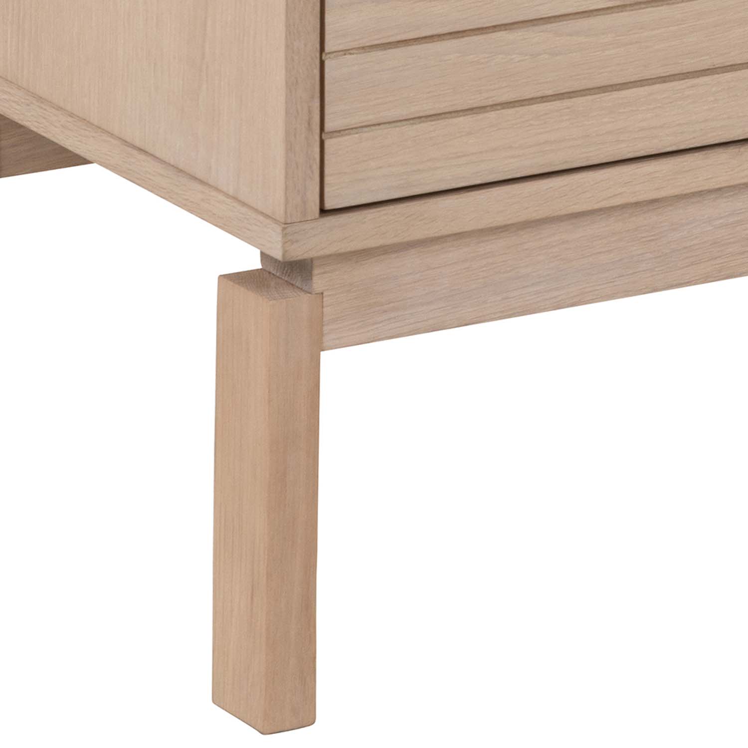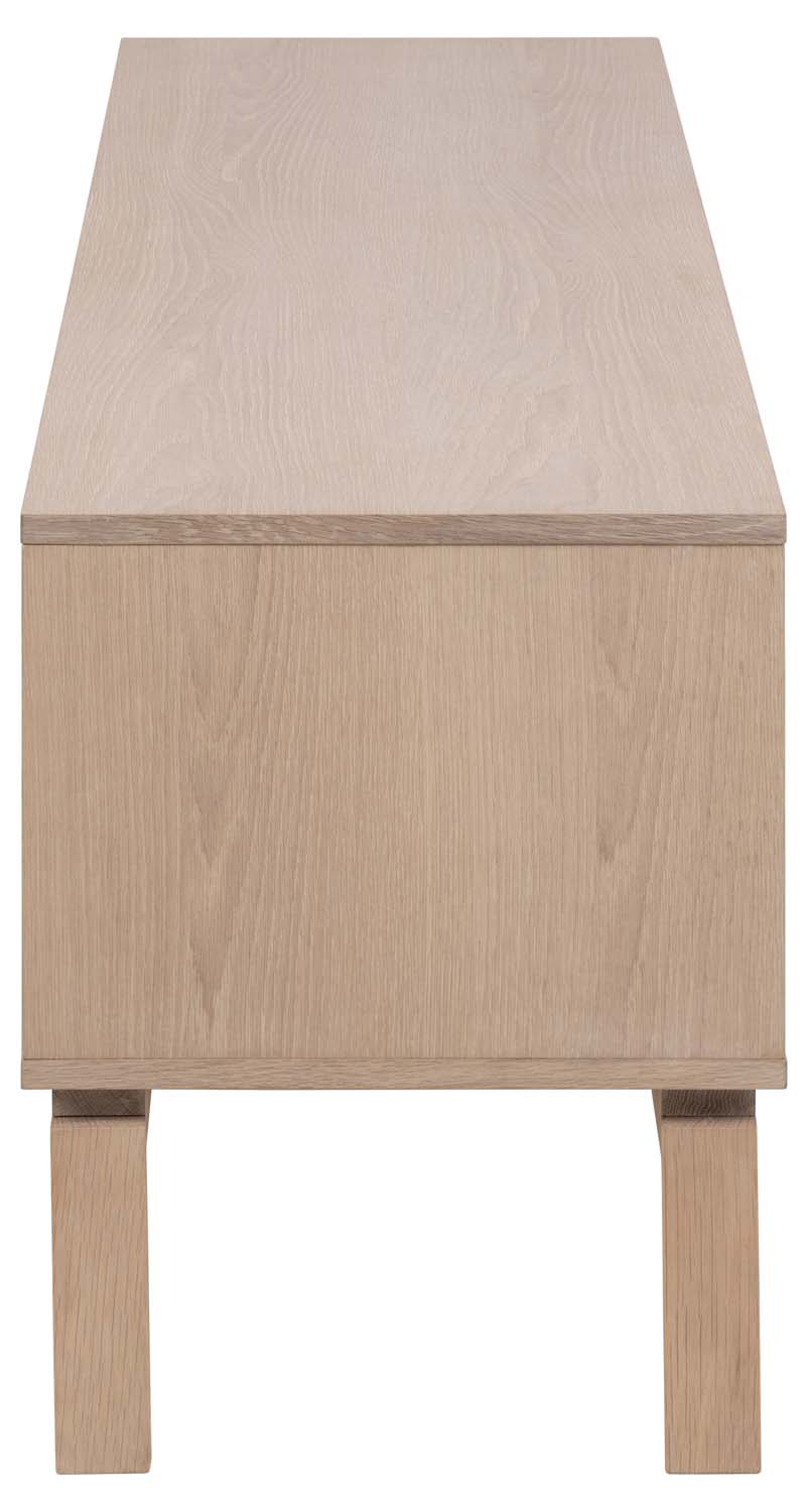 Švaraus ir harmoningo dizaino televizoriaus staliukas iš baltai pigmentuoto alyvuoto ąžuolo. Spintelės frontai turi įdomių detalių ir sukuria optinę iliuziją. Už dvejų durelių ir lentynose yra daug vietos daiktams laikyti. Spintelės durelės atsidaro stumdomos. 3 reguliuojamos lentynos. Matmenys: 160x40xH50 cm.
