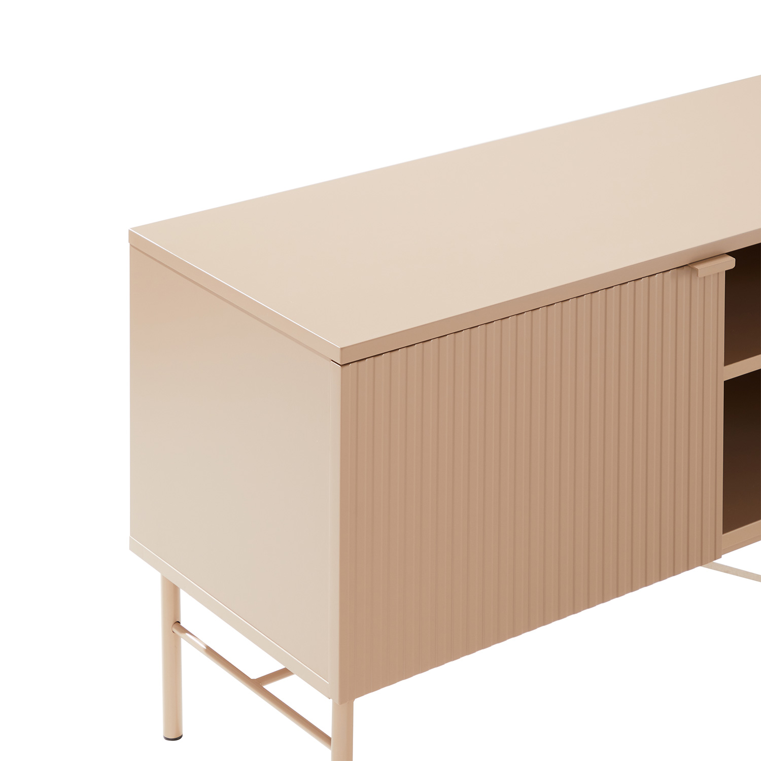 TV staliukas SEQUENCE su 2 durelėmis ir atvira lentyna 150x40xH55cm, kapučino spalvos. TV staliuko korpusas pagamintas iš MDF. Dryžuotos durelių plokštės su reljefiniu paviršiumi suteikia staliukui išskirtinę ir madingą išvaizdą. TV staliukas padengtas patvariais poliuretano dažais. Metalinis pagrindo rėmas ir kojos dažytos milteliniu būdu.