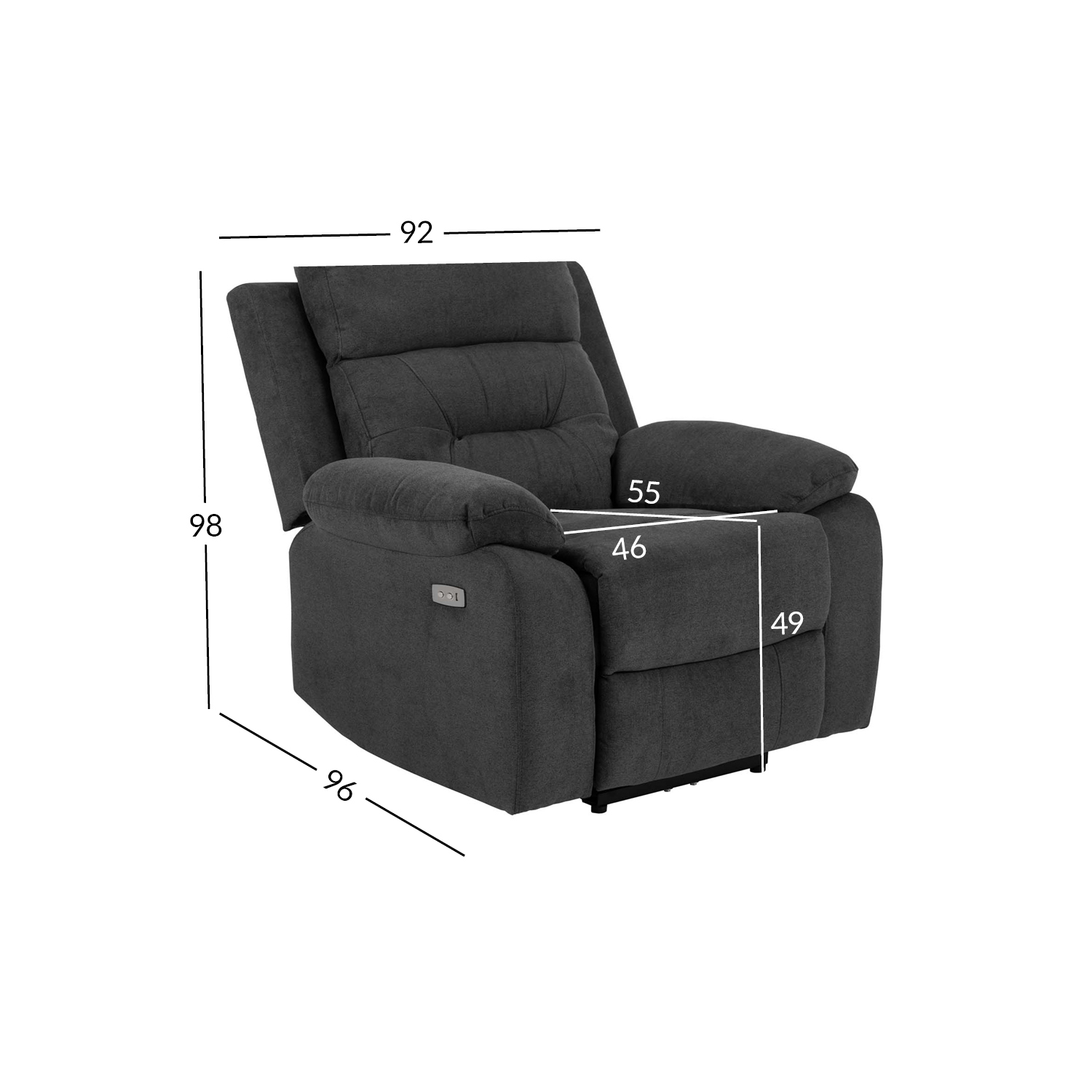 Dėl kišeninių spyruoklių, paminkštintų porankių ir minkštų apmušalų šis minkštasuolis yra itin patogus. Kad kelionė būtų dar malonesnė, kėdė turi motorizuotą atsilenkimo funkciją ir USB-A jungtį. Kėdės matmenys yra 92x96xH98 cm. PRIEŽIŪRA: Priežiūra apsiriboja dulkių siurbliu ir dėmių šalinimu. Dėmių valymas turėtų būti atliekamas atsargiai. Pirmiausia išbandykite dėmių šalinimo priemones mažiau matomoje vietoje. Niekada nenaudokite tirpiklių. Nestatykite baldų tiesioginiuose saulės spinduliuose. Pagrindas: Kasdieniam valymui naudokite švelniame muiluotame vandenyje tvirtai išskalbtą šluostę. Kad nerūdytų, nuvalykite sausai. Nebraižykite paviršiaus kietais daiktais.