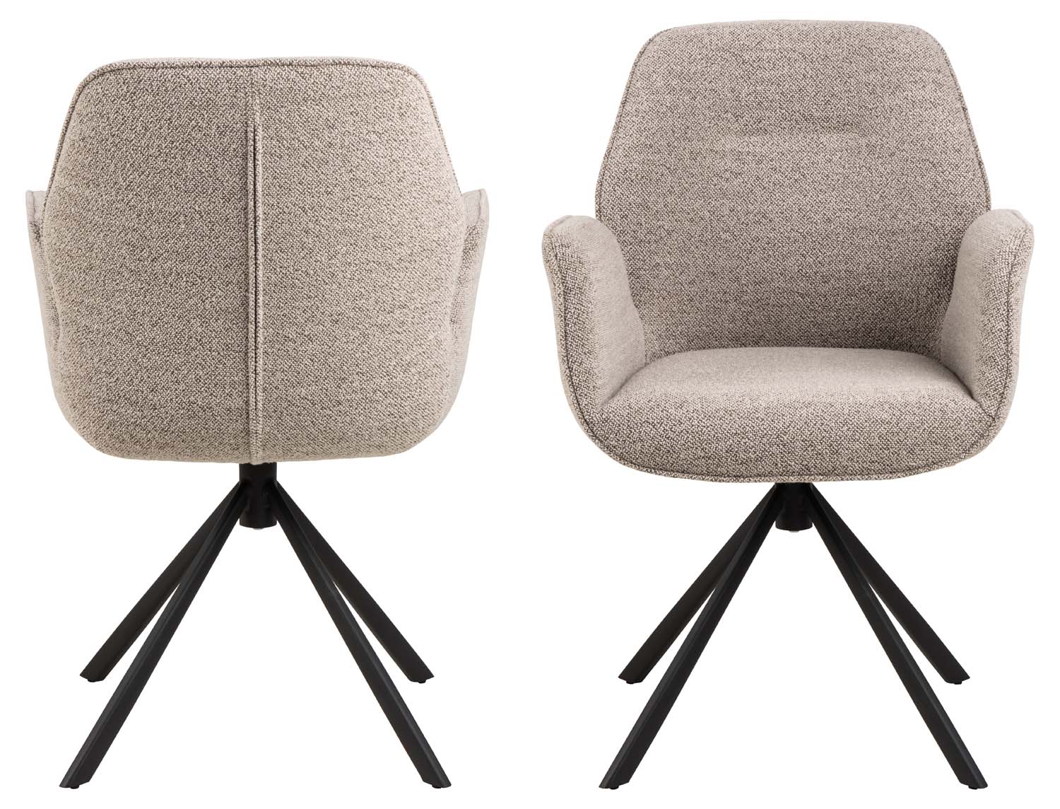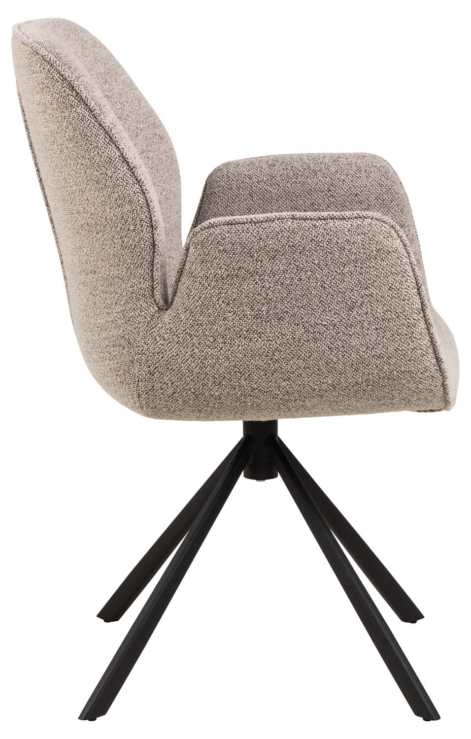 Moderni elegantiška valgomojo kėdė. Minkšta, apmušta boucle audiniu. Juodais milteliais dengtas metalinis pagrindas, pasukamas. Tarpas tarp porankio ir atlošo. Gaminio matmenys 60,5×58,5xH91 cm.