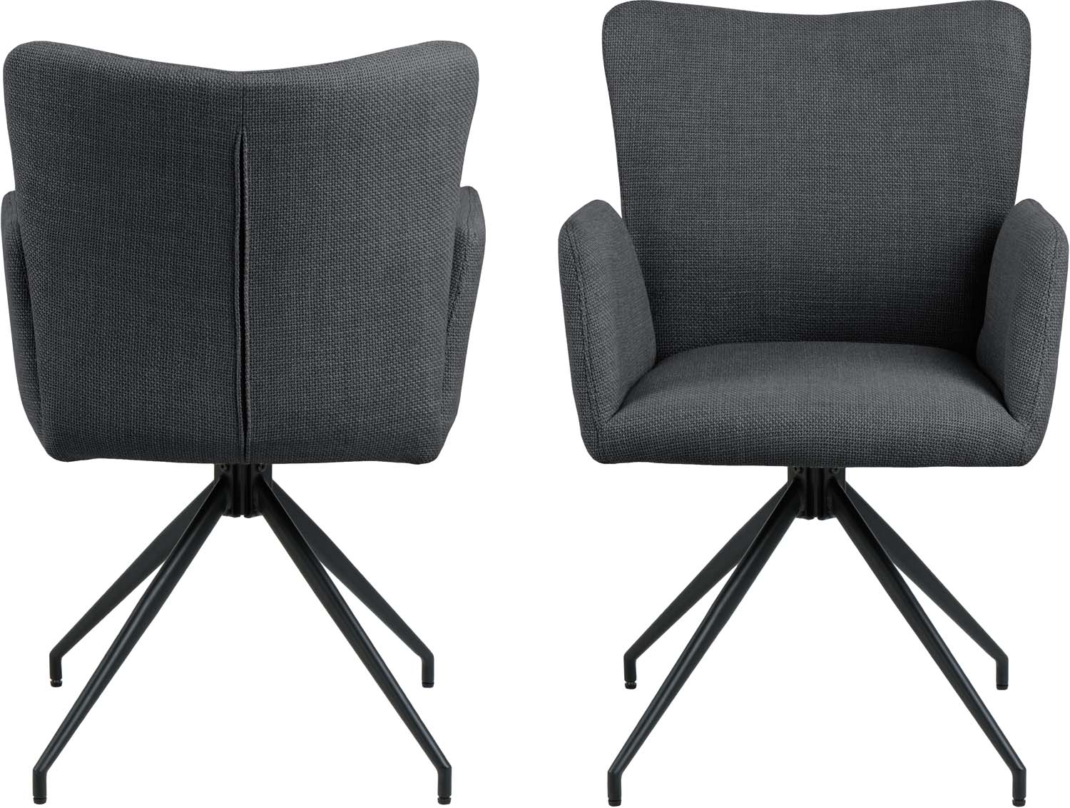 Stilinga elegantiško silueto valgomojo kėdė. Apmušta tamsiai pilku audiniu su dviejų atspalvių efektu. Plyšys tarp atlošo ir porankio. Juodais milteliais dengtas metalinis pagrindas, pasukamas. Gaminio matmenys 57×61,5xH86 cm.