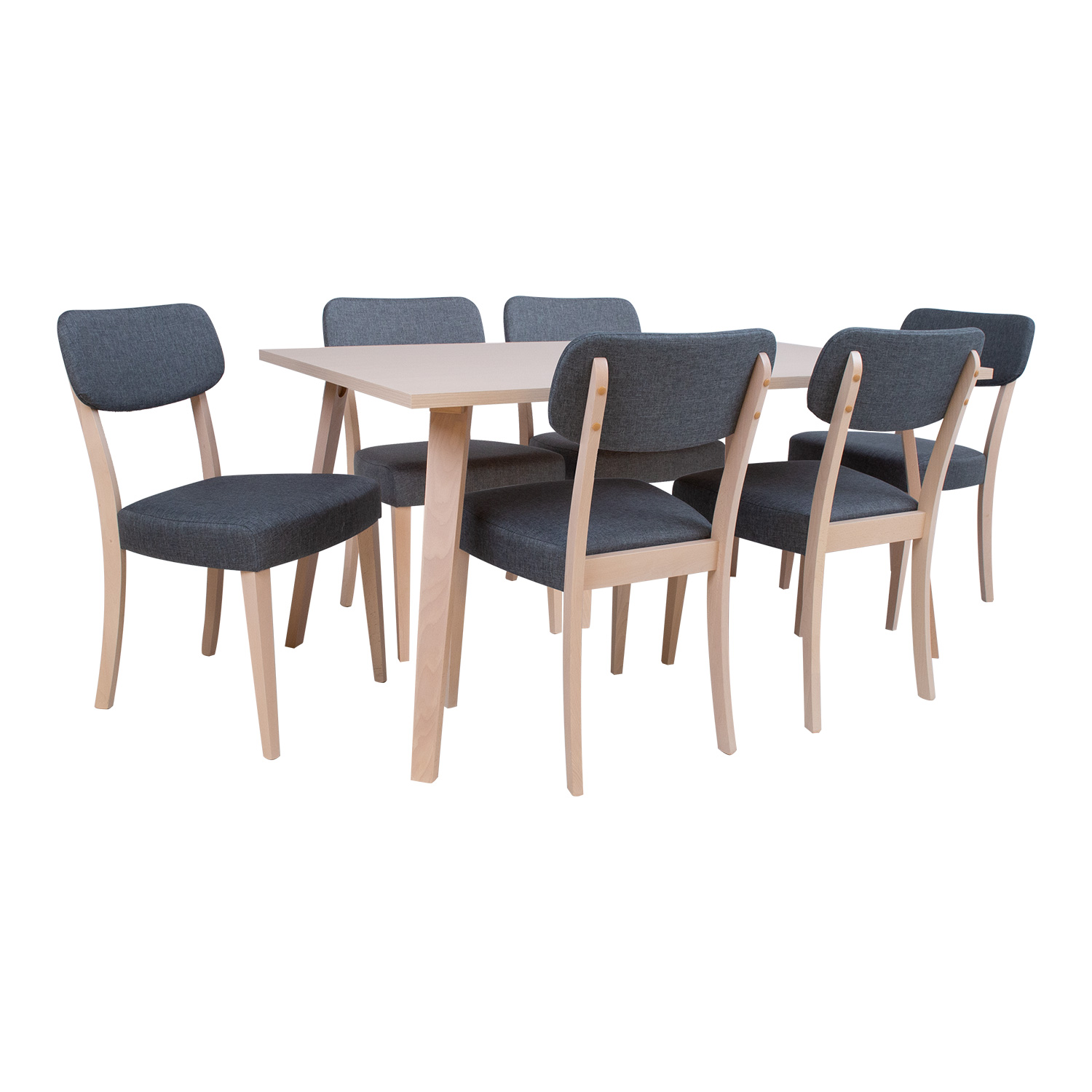 Valgomojo stalo ADORA komplektas su 6 kėdėmis. Valgomojo stalas ADORA 150x90xH73cm. Stalo stalviršis pagamintas iš korinės plokštės ir padengtas natūralia buko fanera. Storis 25 mm. Kojos ir rėmas pagaminti iš buko masyvo. Stalas padengtas medžio atspalvio baltu laku. Kėdė ADORA 49x58xH85,5 cm, sėdimosios dalies aukštis 50 cm. Kėdė pagaminta iš medžio masyvo. Sėdimoji dalis ir atlošas aptraukti pilku poliesterio audiniu. Medinės dalys apdailintos medžio atspalvio baltu laku. Ribinis svoris 100 kg.