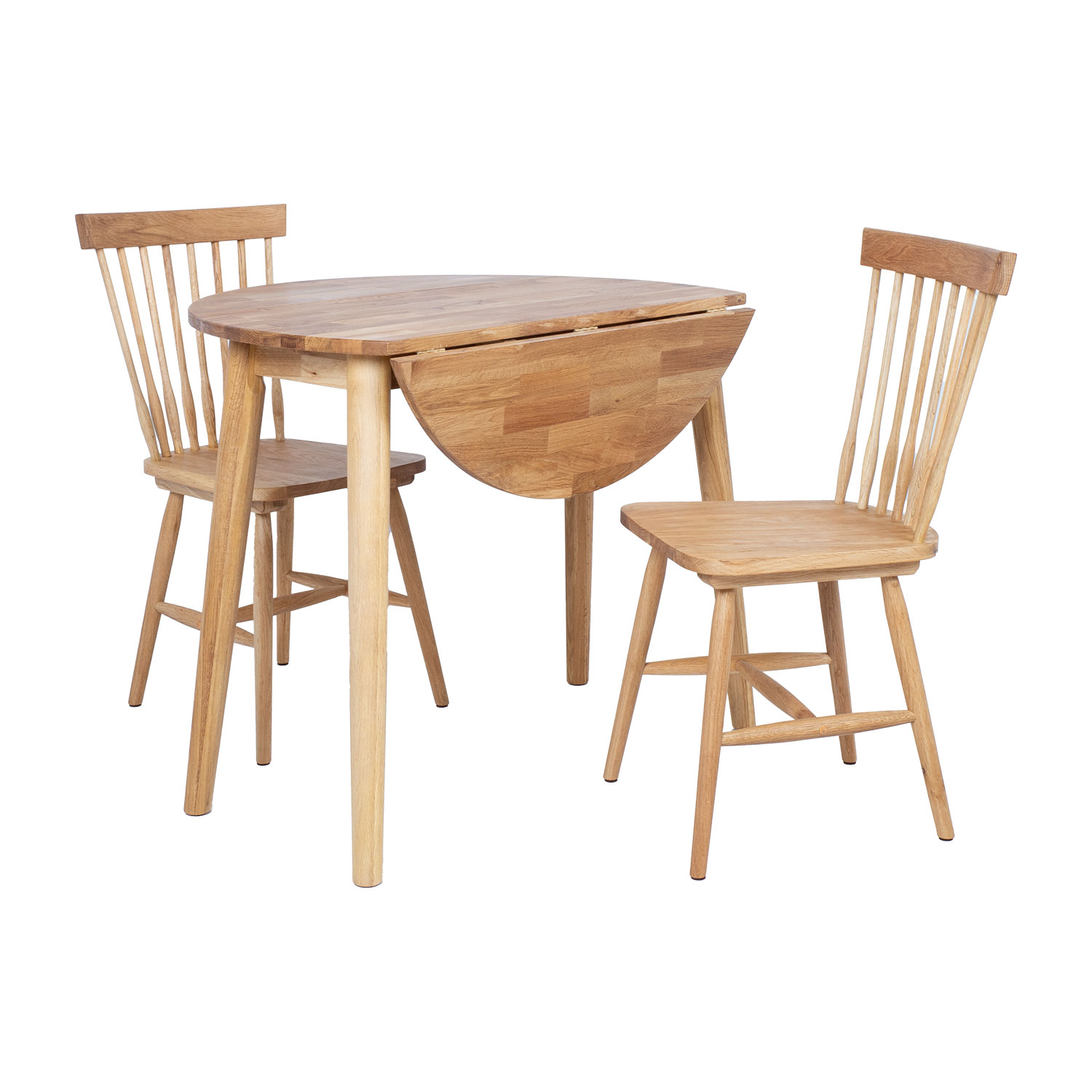 Apvalus sulankstomas medžio masyvo stalas yra funkcionalus ir praktiškas sprendimas mažesnei erdvei įrengti arba naudoti kaip papildomą stalą. Centrinė stalo stalviršio plokštė yra 40 cm pločio, kiekvienoje pusėje yra po 25 cm atlenkiamą dalį. Jei stalo paviršius nėra visiškai išnaudojamas, vieną arba abi sulankstomas plokštes galima nuleisti.
