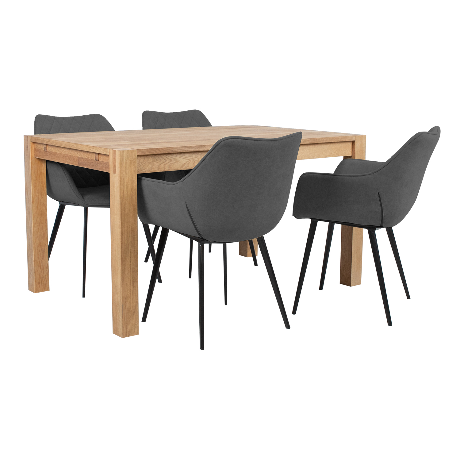 Valgomojo stalo komplektas CHICAGO NEW su 4 kėdėmis. Stalo matmenys 140x90xH76 cm. Stalo stalviršis: Stalo stalviršis: MDF, natūrali ąžuolo fanera, alyvuotas. Stalo kojos 8×8 cm iš medžio masyvo, dengtos ąžuolo lukštu. Valgomojo stalą galima prailginti. Iš abiejų stalo galų pusių galima pridėti 45×90 cm dydžio stalo prailginimus. Stalo prailginimai į komplektą neįeina, juos galima įsigyti atskirai, gaminio kodas 84026. Kėdės matmenys 61×60,5xH84cm. Kėdės sėdimoji dalis lengvai apmušta ir aptraukta tamsiai pilku audiniu. Kojos pagamintos iš metalo ir padengtos juoda milteline danga. Ribinis svoris 100 kg.