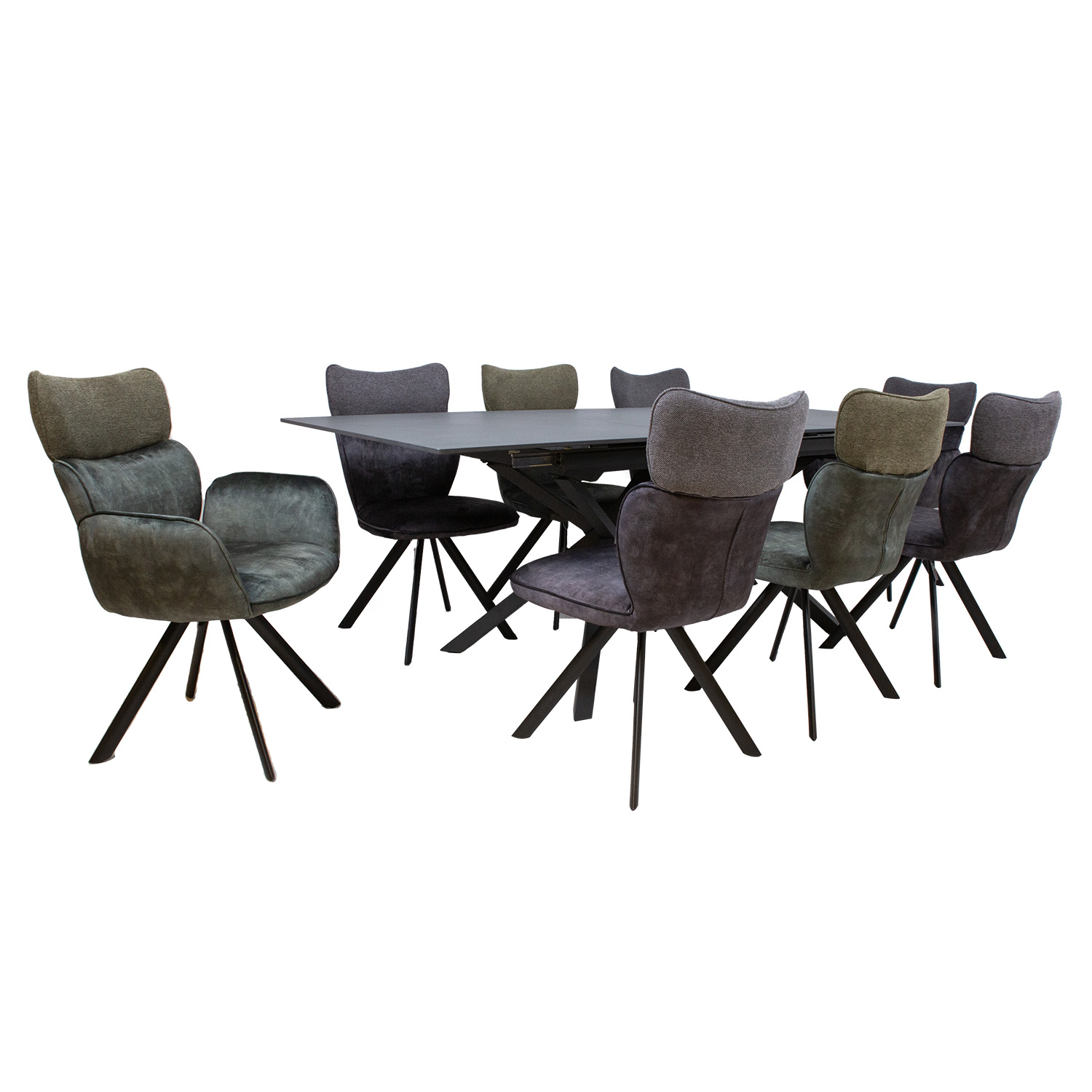 Valgomojo stalo rinkinys EDDY su 8 kėdėmis. Komplektą sudaro valgomojo stalas su pilku akmens masės stalviršiu ir 2+6 kėdės. Stalo matmenys 160/220x90xH76 cm. Stalas per vidurį yra išskleidžiamas. Stalo stalviršio šonai juda ant metalinių slydiklių, prailginimas dedamas po stalviršiu. Sukepintas akmens stalviršis pagamintas naudojant naujovišką technologiją, kuri imituoja natūralaus akmens susidarymo procesą žemės plutos gelmėse. Kaolino arba porcelianinio molio dalelės apdorojamos 1200 laipsnių pagal Celsijų temperatūroje, todėl gaunama medžiaga, savo savybėmis ir išvaizda primenanti natūralų akmenį. Ji plona, bet labai tvirta, atspari dilimui, atlaiko aukštą temperatūrą, nesugeria dėmių, ją labai lengva valyti ir prižiūrėti. Kadangi nenaudojamos cheminės rišamosios medžiagos, ši medžiaga yra higieniška. DĖMESIO! Venkite smūgių, atsitrenkimų ir kritimų. Stalo stalviršio storis yra 12 mm. Stalas turi juodos spalvos milteliniu būdu dengtas metalines kojas. Kėdė EDDY 63x55xH89 cm su rankenomis, 49x55xH89 cm be rankenų. Užvalkalo medžiaga: žalias aksomas. Kėdės sėdimosios dalies aukštis 48 cm, sėdimosios dalies plotis 45/49 cm, sėdimosios dalies gylis 42 cm, atlošo aukštis 47 cm, porankio aukštis 64 cm. Kėdžių sėdynės lengvai apmuštos ir aptrauktos poliesterio audiniu. Naudojami audiniai yra tonas į toną, tačiau skirtingos paviršiaus tekstūros. Juodos spalvos metalinės kojos dengtos milteliniu būdu. Ribinis svoris 120 kg.