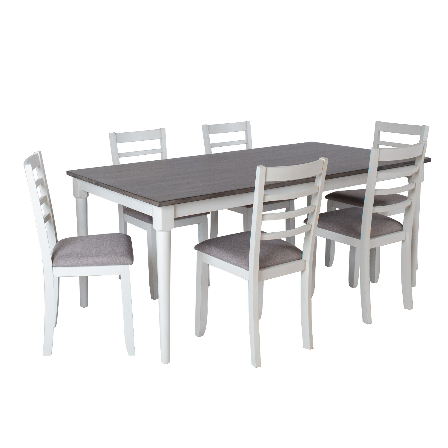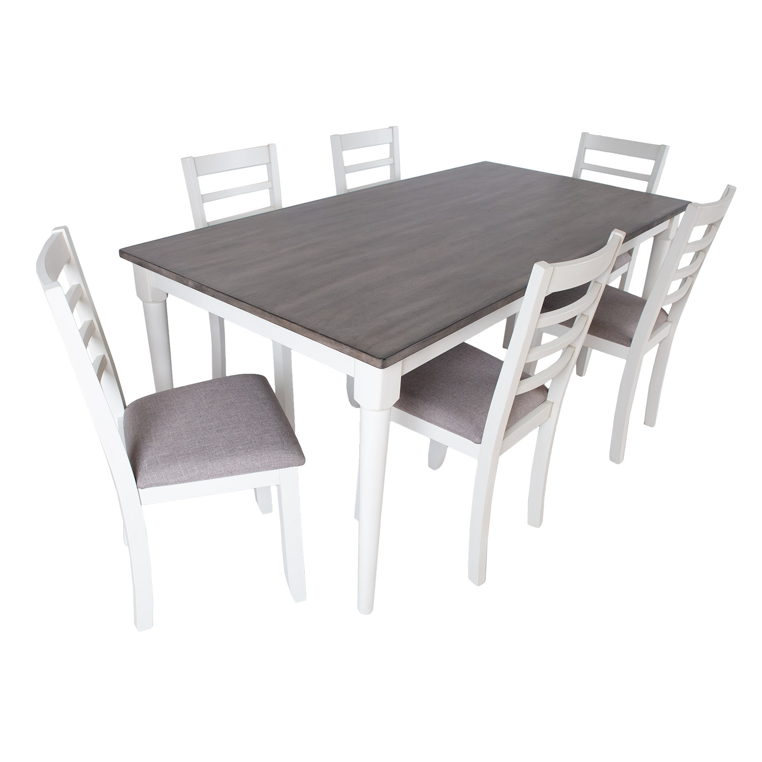 Valgomojo stalo komplektas JANELLE su 6 kėdėmis. Stalo matmenys 183x91xH75 cm. Stalo stalviršis: pilkos spalvos baldinė plokštė. Stalo kojos ir rėmas iš kaučiukmedžio, dažyti baltai. Bendrieji kėdės matmenys: 42x50xH88,5 cm, sėdimosios dalies plotis 42 cm, sėdimosios dalies gylis 37 cm, sėdimosios dalies aukštis 49 cm. Kėdės sėdynė lengvai apmušta ir aptraukta pilku audiniu. Kojos ir karkasas pagaminti iš kaučiukmedžio ir nudažyti baltai. Ribinis svoris 110 kg.