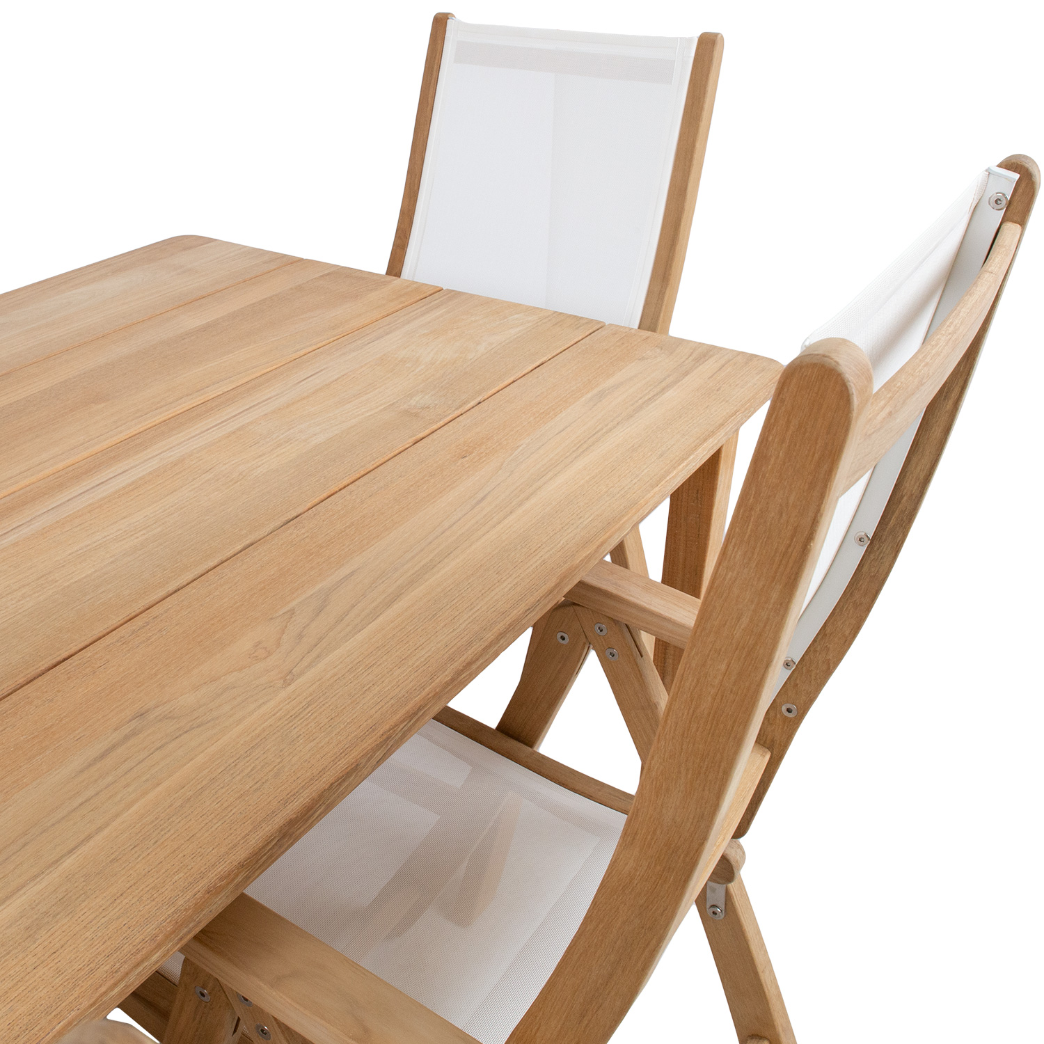 Valgomojo komplektas MALDIVE stalas ir 6 kėdės. Stalo matmenys 220x100xH75 cm. Stalas pagamintas iš kruopščiai atrinkto brandaus tikmedžio. Mediena turi smulkiai nušlifuotą paviršių, kuris yra visiškai natūralus. Dėl didelio natūralių aliejų kiekio tikmedis yra labai atsparus drėgmei ir medienos pažeidimams, todėl jo nereikia papildomai apdirbti ar aliejuoti. Bendrieji kėdės matmenys: 60x70xH110 cm, sėdimosios dalies plotis 48 cm, sėdimosios dalies gylis 46 cm, sėdimosios dalies aukštis 45 cm, atlošo aukštis 70 cm, porankio aukštis 66 cm. Ribinis svoris 120 kg. Kėdės rėmas pagamintas iš tikmedžio. Sėdynė ir atlošas pagaminti iš balto batylino. Svarbiausia batylino medžiagos savybė – jos elastingumas ir optimalus sėdėjimo komfortas. Be išskirtinio mechaninio atsparumo, ši medžiaga pasižymi dideliu atsparumu cheminėms medžiagoms. Sintetinis apmušalas užtikrina itin didelį atsparumą atmosferos poveikiui ir UV spinduliams. Batyline nesugeria drėgmės, todėl medžiaga labai greitai džiūsta, yra labai atspari dėmėms ir pelėsiui, ją lengva valyti. Norėdami sureguliuoti atlošą, pakelkite porankius, pasirinkite tinkamą atlošo padėtį ir pritvirtinkite porankius. Galima rinktis iš 6 skirtingų padėčių. Tikmedžio mediena yra labai atspari įvairioms oro sąlygoms ir daugelį metų išlaikys puikią išvaizdą bei geriausias savybes. Kuo brandesnė mediena, tuo didesnis jos tankis ir didesnis aliejaus kiekis, tuo ji atsparesnė ir stabilesnė oro sąlygoms. Laikui bėgant saulės spinduliai ir drėgmė medienos paviršių nudažo gražia sidabriškai pilka spalva. Šis spalvos pasikeitimas yra natūralus ir neturi įtakos medienos kokybei. PRIEŽIŪRA: reguliariai valykite, saugokite nuo drėgmės ir UV spindulių. Norint atnaujinti medinius paviršius, jei reikia, juos galima lengvai nušlifuoti. Norėdami prailginti lauko baldų tarnavimo laiką, rekomenduojame naudoti lauko dangas. PRIEŽIŪRA: Pasibaigus vasaros sezonui, rekomenduojame sodo baldus laikyti patalpoje. Pasibaigus vasaros sezonui, rekomenduojame palikti baldus sode žiemos mėnesiais. Sandėliavimui naudokite sausą ir gerai vėdinamą patalpą.