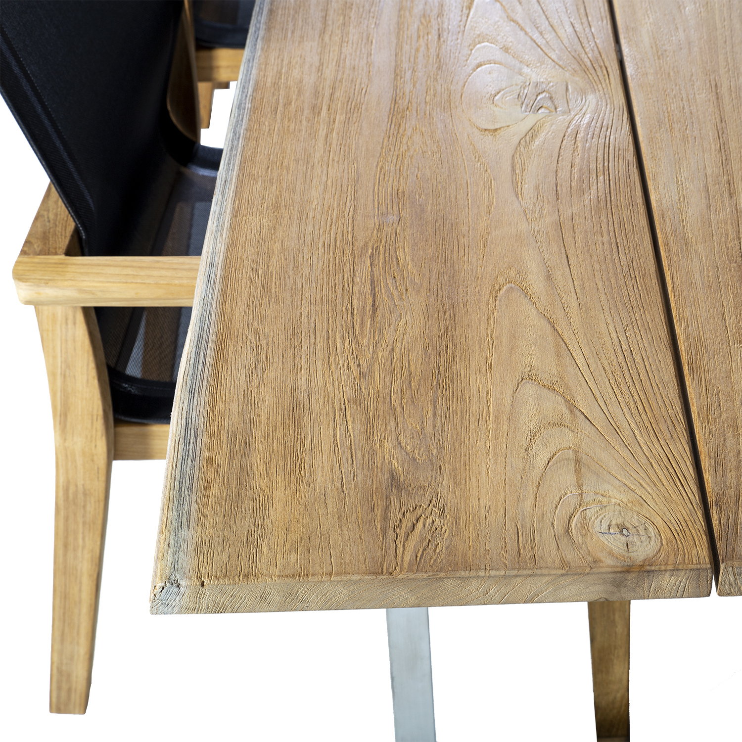 Valgomojo komplektas NAUTICA stalas ir 8 kėdės. Stalo matmenys 280x100xH76 cm. Trijų plokščių stalo stalviršis netašytais kraštais pagamintas iš A klasės tikmedžio. Smulkiai poliruotas kaimiškas paviršius yra visiškai natūralaus grožio, jis nebuvo alyvuotas ar kitaip chemiškai apdorotas. Stalo kojos ir pagrindo rėmas pagaminti iš nerūdijančio plieno. A klasės tikmedis yra puiki natūrali medžiaga prabangiems lauko baldams gaminti. Mediena yra tankios ir tolygios struktūros, gražaus aksominio blizgesio, auksinės kviečių ir metonijos spalvos. Dėl didelio natūralių aliejų kiekio tikmedis yra labai atsparus drėgmei ir kenkėjams. Jis labai atsparus įvairioms oro sąlygoms ir daugelį metų išlaiko puikią išvaizdą bei geriausias savybes. Saulės šviesa ir drėgmė ilgainiui stalo paviršių nudažo gražia sidabriškai pilka spalva. Šis spalvos pasikeitimas yra natūralus ir neturi įtakos medienos kokybei. Išskirtinis tvenkinio medienos stalas tinka naudoti ir patalpose. Kėdės rėmas pagamintas iš smulkiai nušlifuoto, nelakuoto tikmedžio. Sėdynė ir atlošas pagaminti iš juodo batilino. Svarbiausia batylino medžiagos savybė – jos elastingumas ir optimalus sėdėjimo komfortas. Be išskirtinio mechaninio atsparumo, ši medžiaga pasižymi dideliu atsparumu cheminėms medžiagoms. Sintetinė danga užtikrina itin didelį atsparumą atmosferos poveikiui ir ultravioletiniams spinduliams. Batyline nesugeria drėgmės, todėl medžiaga labai greitai džiūsta, yra labai atspari dėmėms ir pelėsiui, ją lengva valyti. Bendrieji kėdės matmenys yra 64x65xH90 cm. Sėdimosios dalies plotis 47,5 cm, sėdimosios dalies gylis 48 cm, sėdimosios dalies aukštis 43 cm. Atlošo aukštis 48 cm, porankio aukštis 66 cm. Ribinis svoris 120 kg. Kėdės gali būti kraunamos viena ant kitos. PRIEŽIŪRA: reguliariai valykite, saugokite nuo drėgmės ir UV spindulių. Medinius paviršius galima lengvai nušlifuoti, kad jie būtų gaivesni. PRIEŽIŪRA: pasibaigus vasaros sezonui rekomenduojame sodo baldus laikyti patalpoje. Pasibaigus vasaros sezonui, prieš sandėliuojant baldus patartina juos palikti sode, kad atvėstų ir išdžiūtų. Sandėliavimui naudokite sausą ir gerai vėdinamą patalpą.