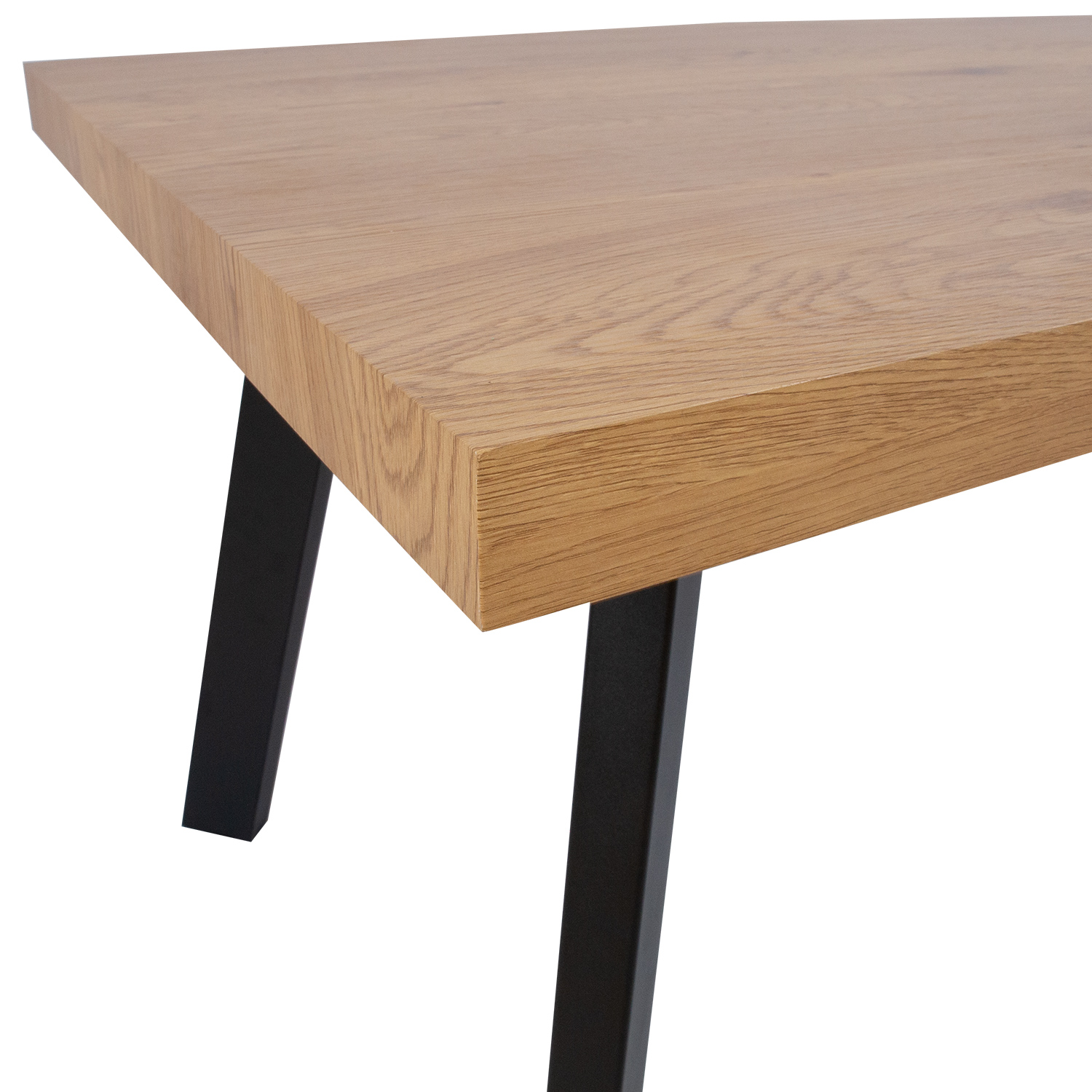 Valgomojo stalas BRIGIT 159/198×84,5xH77cm. Stalo stalviršis 5,4 cm MDF šviesaus medžio rašto. Juodos spalvos milteliniu būdu dengtos metalinės kojos.