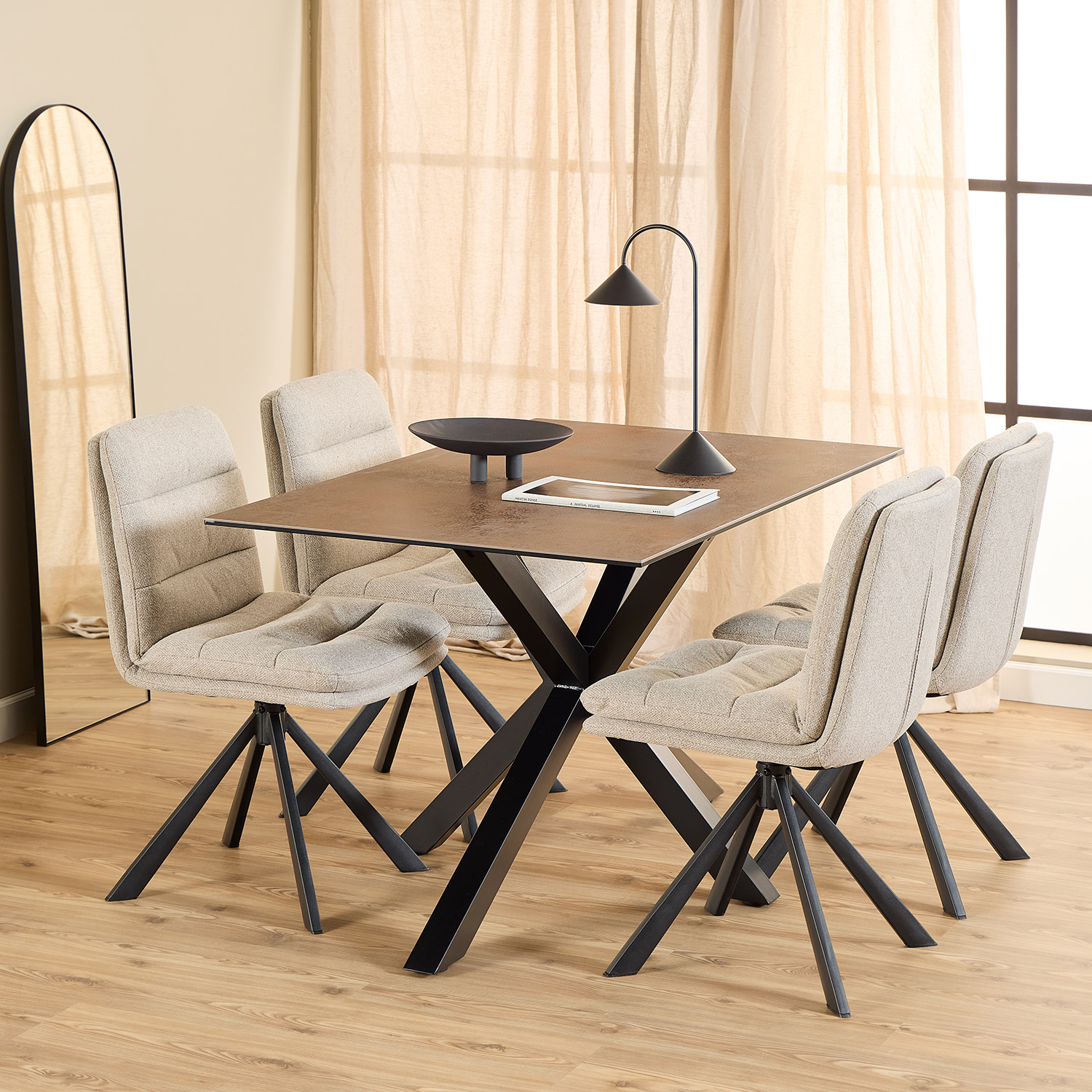 Keramikiniame valgomojo stale telpa 6 žmonės. Stalo stalviršis pagamintas iš karščiui ir įbrėžimams atsparių keraminių plytelių. Skulptūriškas kryžiaus formos pagrindas atrodo šiuolaikiškai. Lengvai prižiūrimos medžiagos daro stalą idealiu bet kurių namų papildymu. Pagrindas pagamintas iš matinės juodos spalvos milteliniu būdu dengto plieno. Matmenys 135x80xH75,5 cm.